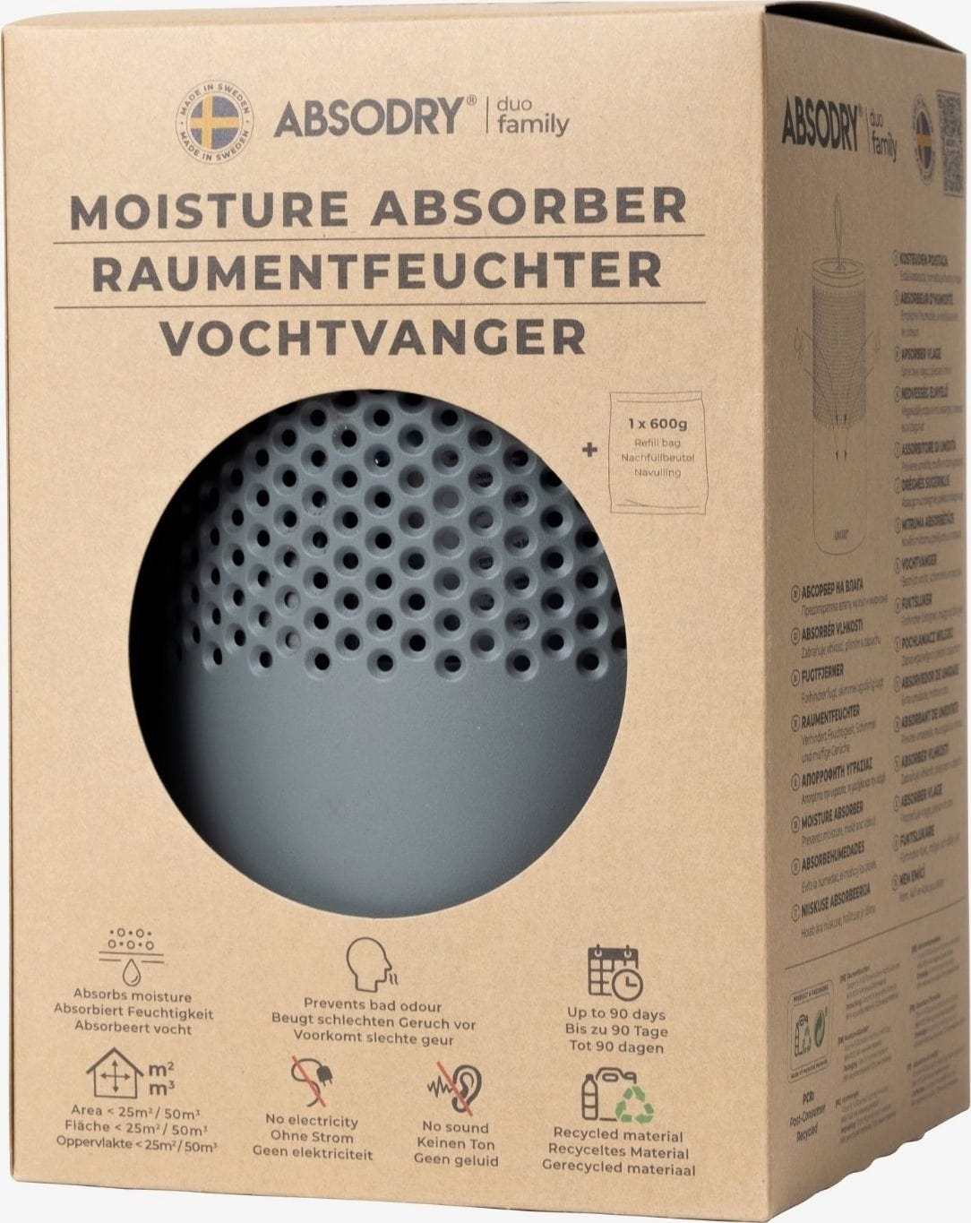 Leveransomfattning: Avfuktare inkl. 600 g refillpåse med fuktabsorberande kristaller