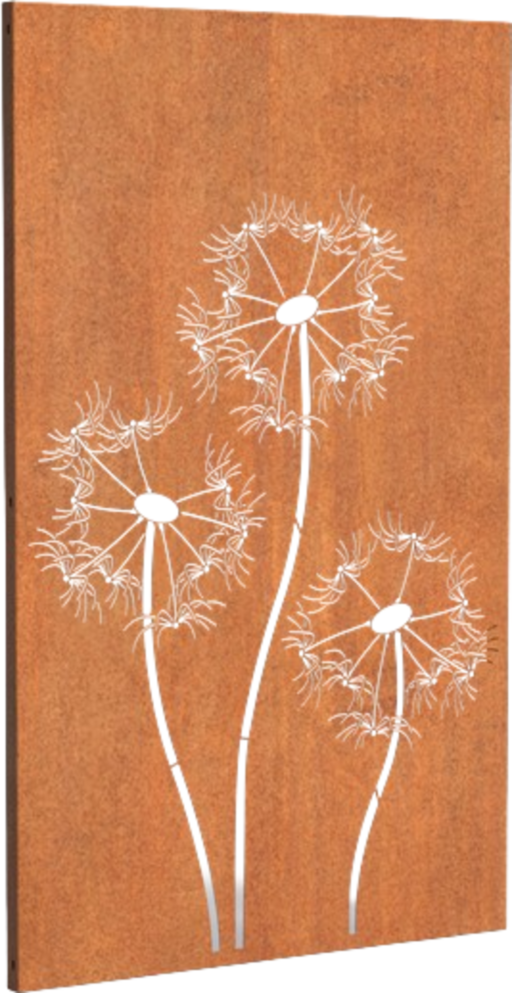 Med insynsskyddspanelen i cortenstål skapar du avskildhet i din trädgård samtidigt som du skyddas mot vind och oönskade blickar. Det laserskurna elementet med ett fint maskrosmotiv blir ett särskilt blickfång och lämnar ett bestående intryck.