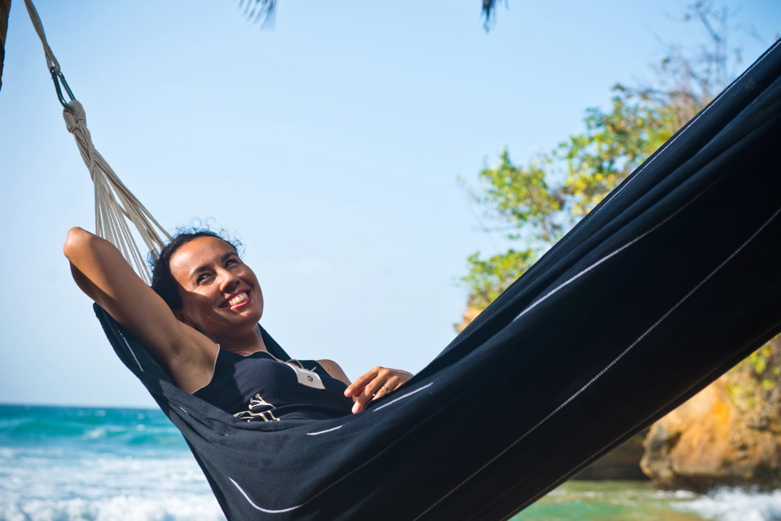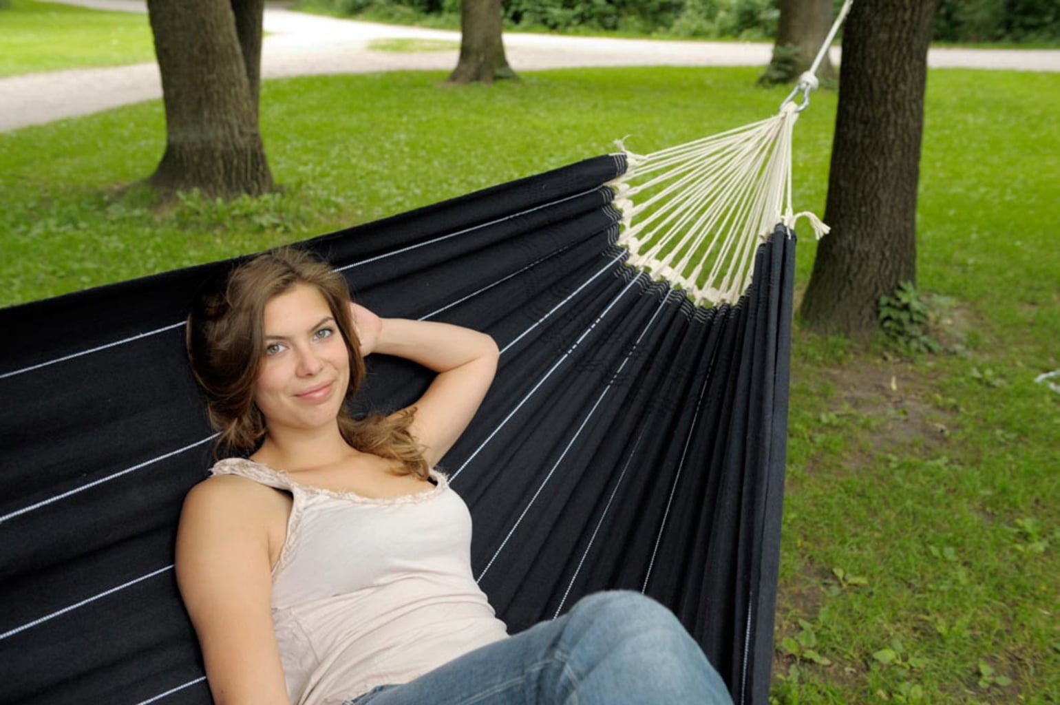 Det täta tyget på 400 g/m² klarar upp till 200 kg, så du kan till och med använda den tillsammans med någon. Handvävda och förstärkta öglor ger ett extra stabilt fäste för linorna och gör hängmattan hållbar i längden. Här kan du ligga bekvämt, slappna av och njuta av livet – gärna i äkta brasiliansk stil!