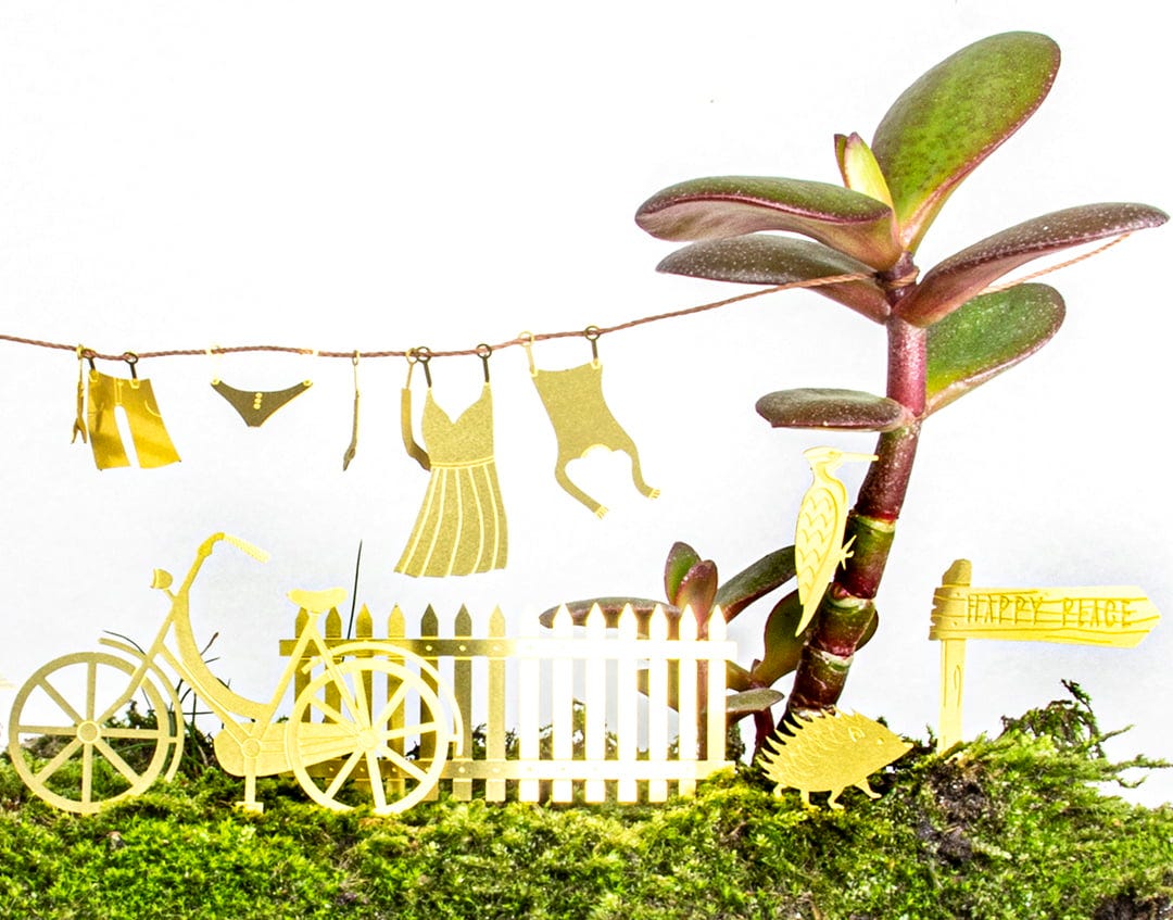- set bestående av en cykel, en bänk, en gatlykta, en tvättlina, en skylt, fyra blad, tre djur