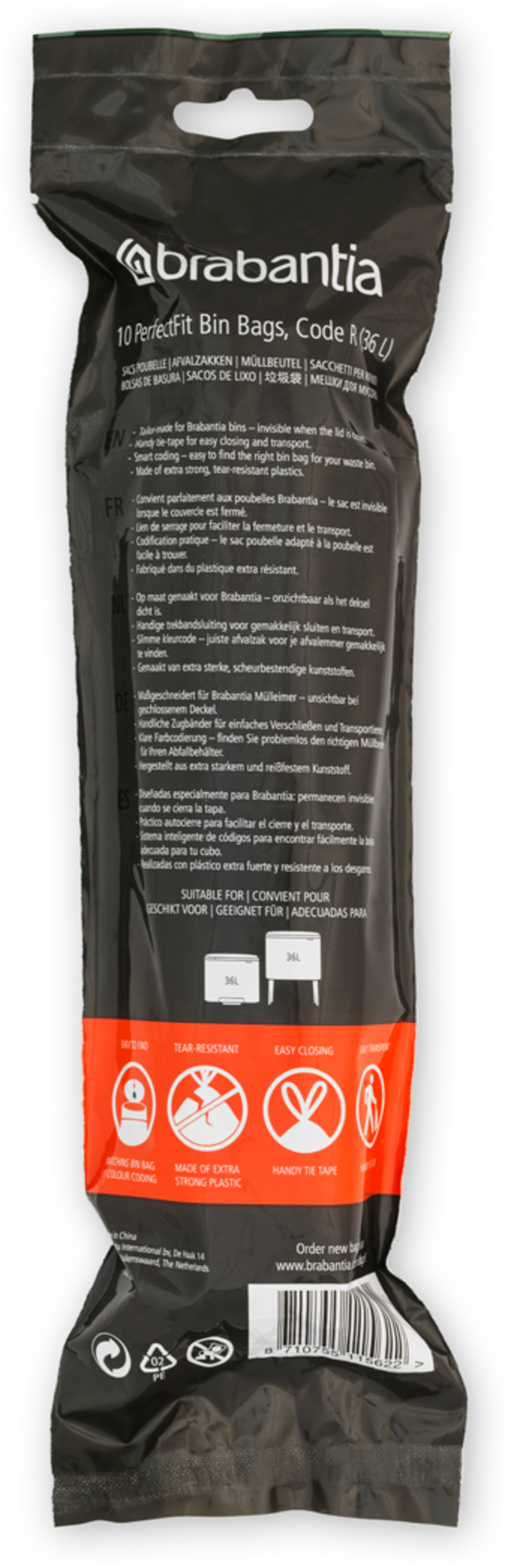 Brabantia PerfectFit-avfallssäckar för Bo Touch Bin - Rullförpackning, 36L (R) - 10 stycken