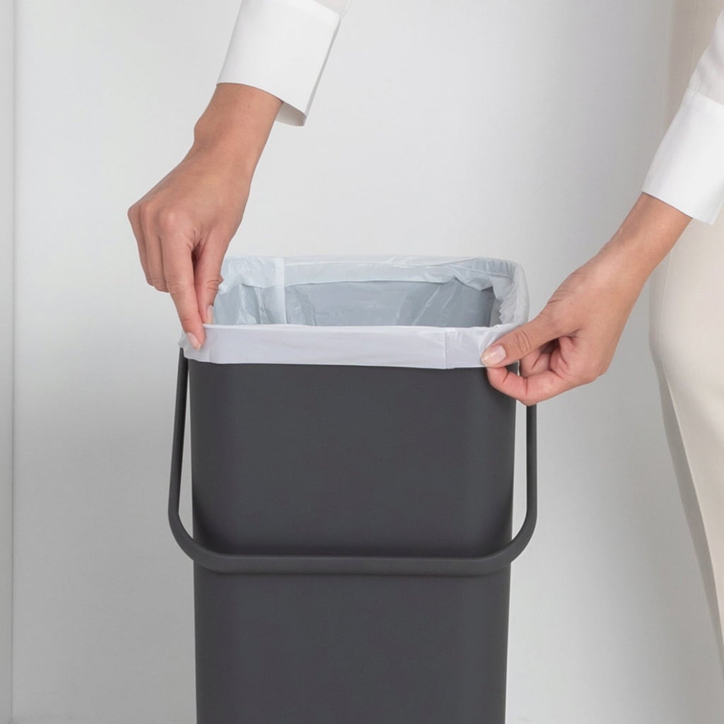 Praktiska Brabantia PerfectFit sopsäckar (storlek L) är lätta att sätta in, medan utskjutande kanter försvinner under locket. Ett matchande mönster finns redan i leveransen.