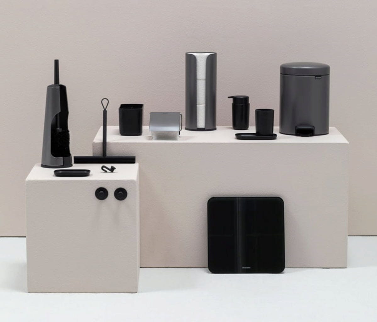 Det tredelade setet består av en robust och hygienisk toalettborste med hållare, en minimalistisk toalettpappershållare och en praktisk toalettpappersdispenser. Allt du behöver för en modern toalett.