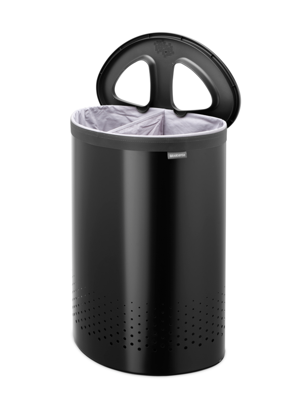 Två tvättlådor som bara tar upp utrymmet för en - det är precis vad den här lika smarta och snygga tvättlådan från Brabantia erbjuder dig. Det är den perfekta utrymmessparande lösningen för att samla och separera tvätt och ger effektivt ordning i ditt hushåll. Den innovativa quick-drop-öppningen gör det möjligt att släppa in tvätten i farten. Den integrerade tvättpåsen med två fack är avtagbar, vilket gör det enkelt att transportera din tvätt. Plastlocket döljer innehållet i lådan så att den passar in i alla rum.