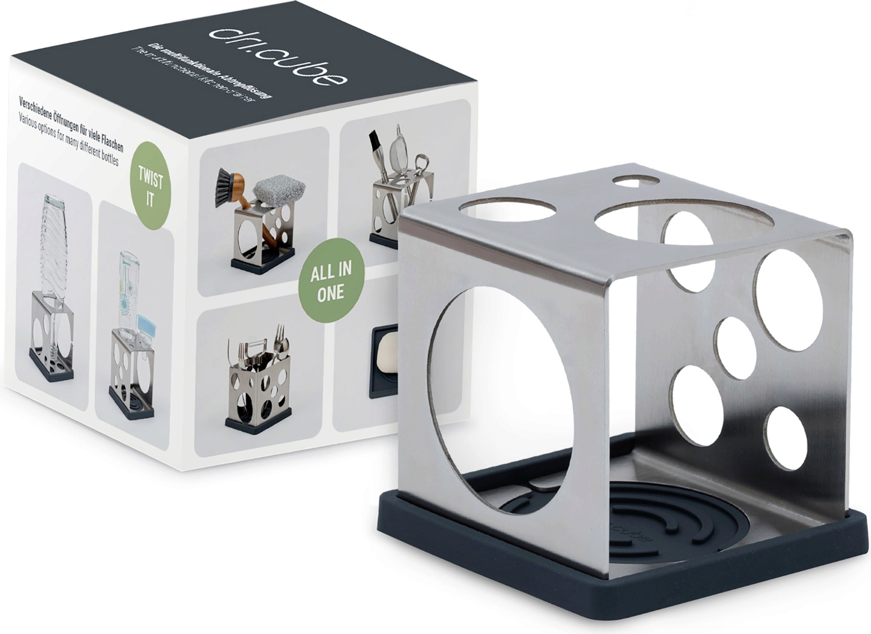 Men dri.cube kan mer än att bara hålla flaskor. Den fungerar även som en stilren organiserare för bestick, diskborstar eller som pennhållare på skrivbordet. Kombinationen av borstat eller pulverlackerat rostfritt stål och en halkfri silikonbas skyddar dina ytor och samlar upp vatten effektivt. Alla delar är värmetåliga och tål diskmaskin, vilket gör rengöringen enkel. En smart lösning som passar perfekt i ett modernt kök.