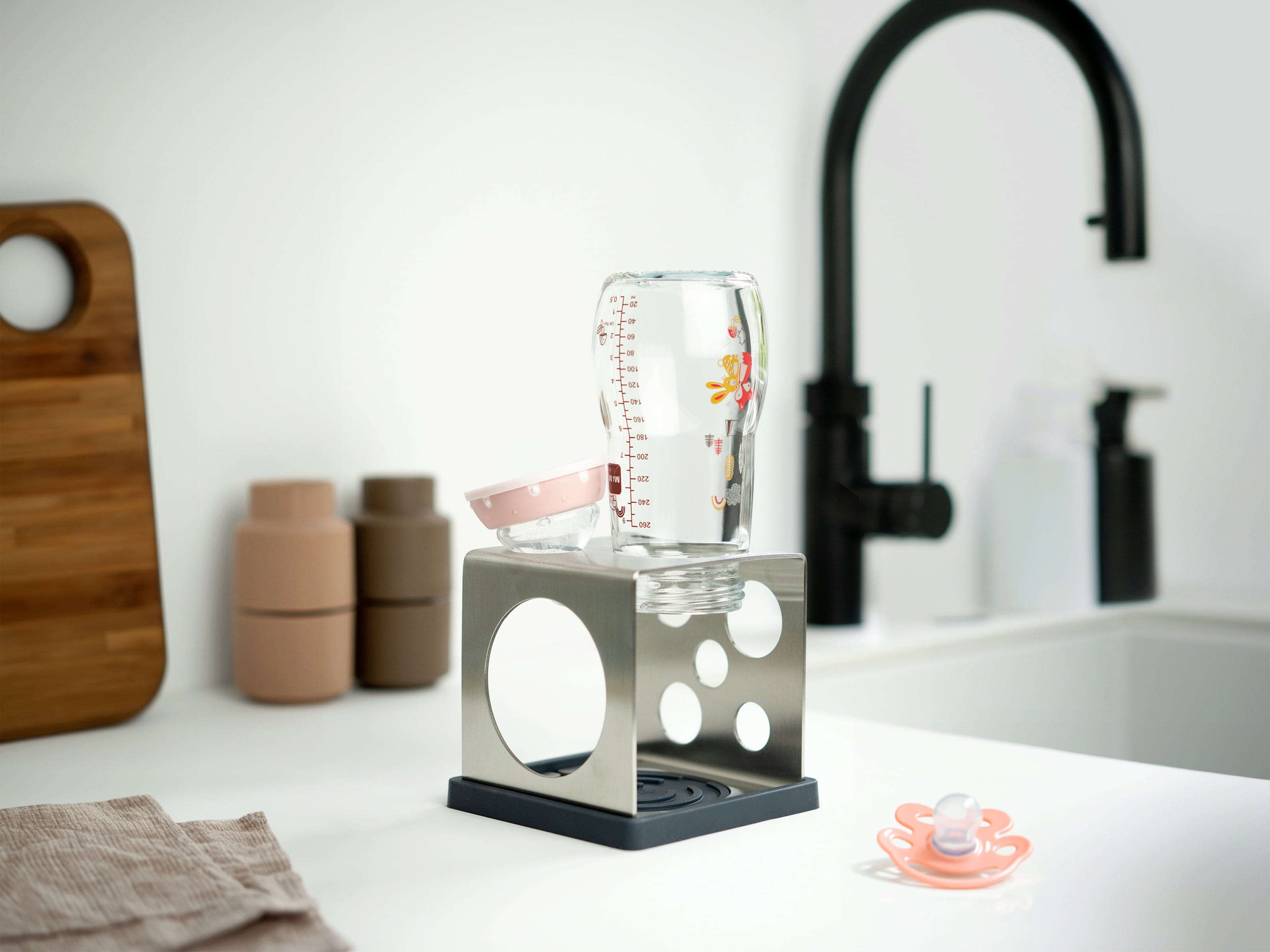 Få in en kompakt allt-i-ett lösning i ditt kök: dri.cube kombinerar minimalistisk schweizisk design med maximal funktion på liten yta. Med sina sex olika sidor erbjuder denna smarta kub rätt avrinningsöppning för nästan varje flaskstorlek - från Sodastream till nappflaskor. Dina flaskor torkar hygieniskt och säkert utan att välta.