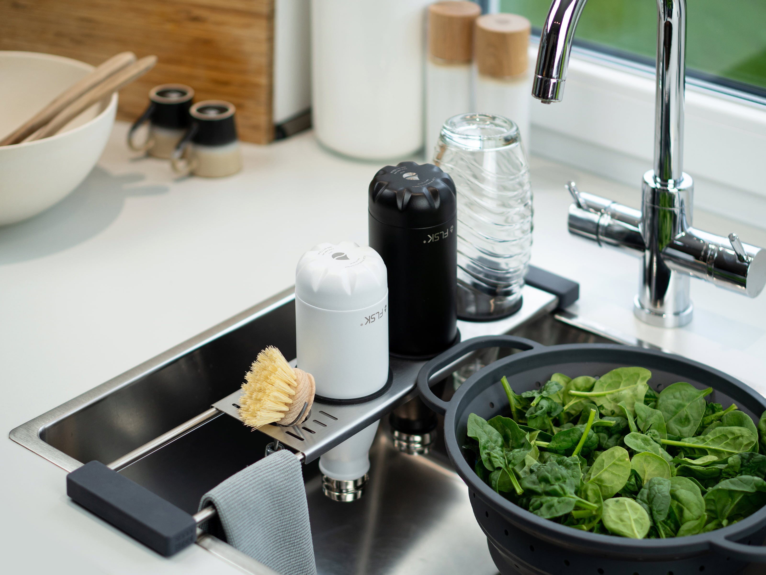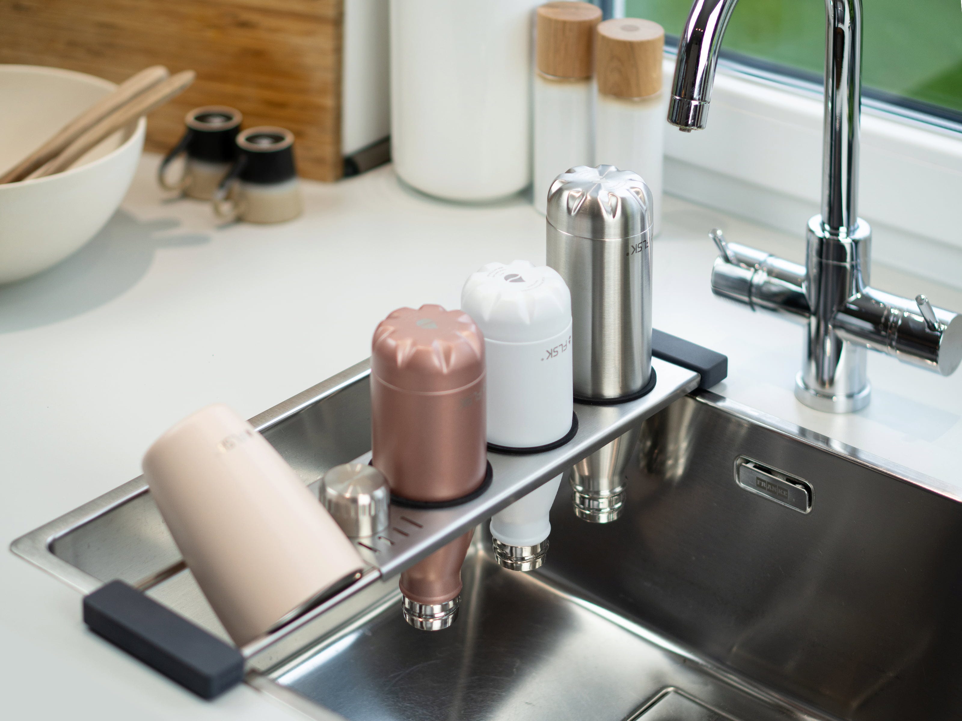 Utöver flaskor finns det även plats för lock, borstar och svampar på den extra avlastningsytan, vilket bidrar till att minska bakteriebildning. Den praktiska teleskopfunktionen gör att drip.it+ enkelt kan anpassas till nästan alla diskhoar och kan även användas som stabil hållare för durkslag vid avhällning av pasta eller sallad. En robust och hållbar lösning som enkelt kan förvaras kompakt efter användning.