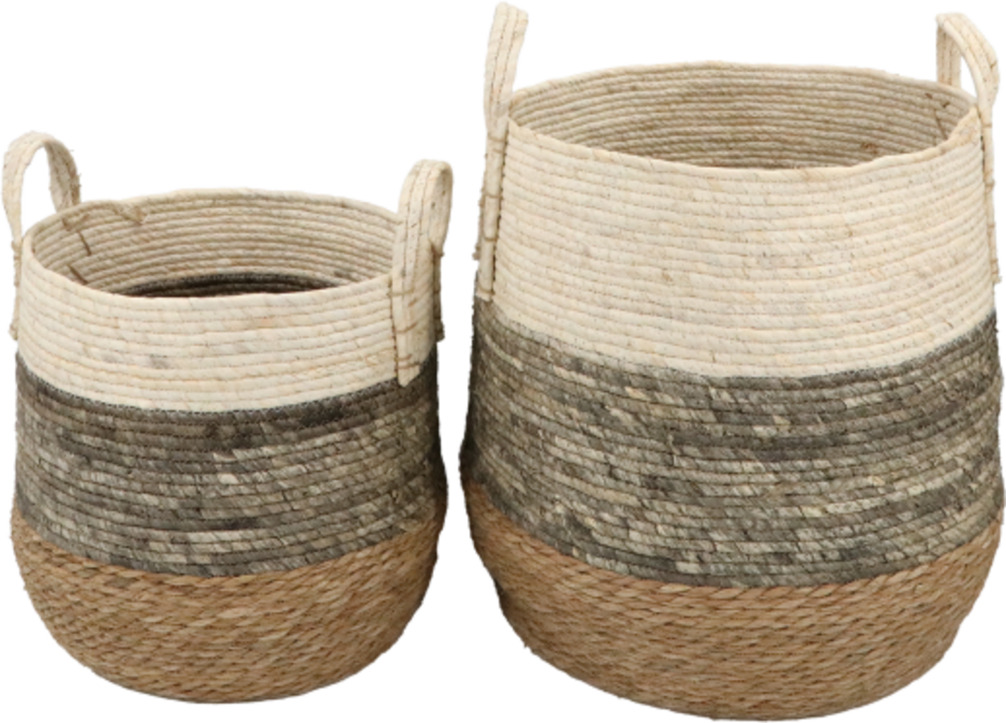 Detta handgjorda korgset i majsrep och torkat gräs imponerar med sin naturliga look och mångsidiga användning. Använd dem som dekorativ förvaring i vardagsrummet för filtar och kuddar, eller som en stilfull lösning i sovrummet – de två storlekarna är perfekta att kombinera.