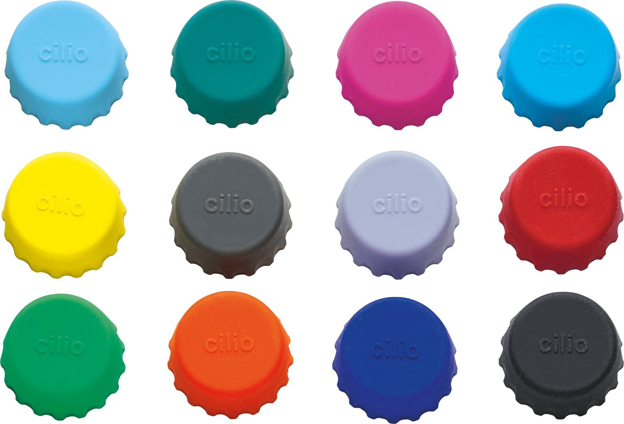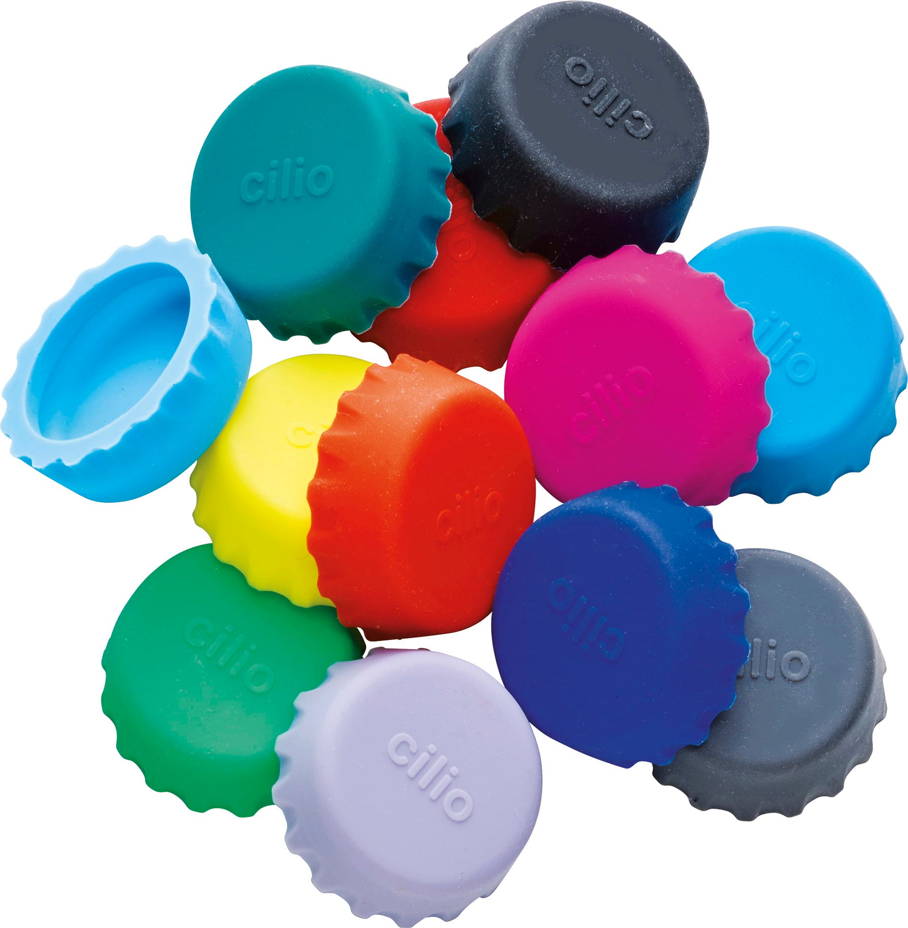 Det 12-delade setet med cilio kapsylskydd SALUTE är den perfekta följeslagaren för fester och picknickar. De elastiska skydden i livsmedelsgodkänt silikon passar alla kapsylflaskor upp till Ø 3 cm och skyddar effektivt mot smuts, insekter och oönskade partiklar. Kolsyrade drycker håller sig fräscha längre, och tack vare de olika färgerna minskar risken för förväxling.