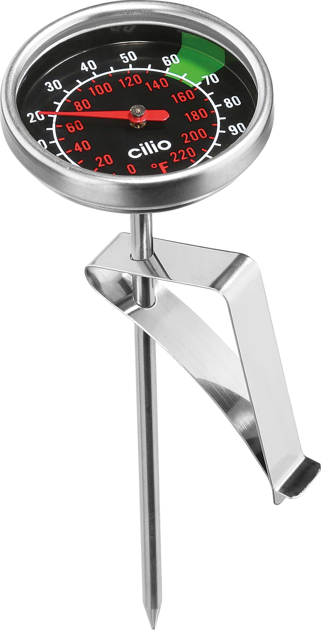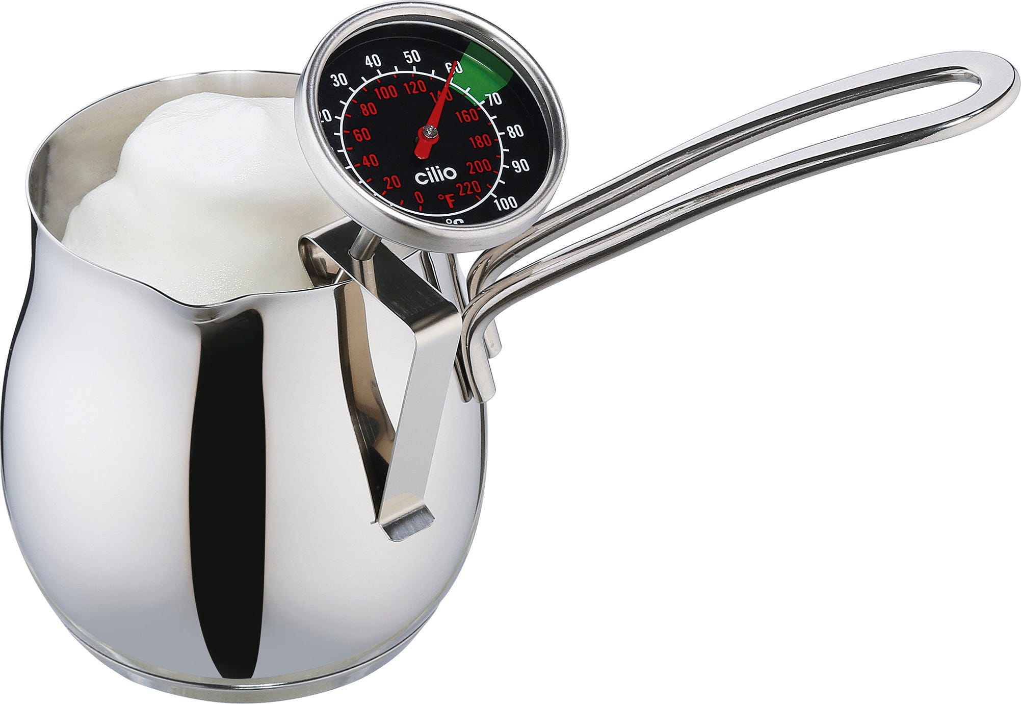 Med mjölktermometern från cilio i högkvalitativt rostfritt stål undviker du effektivt att mjölken överhettas - något som annars förstör både smak och konsistens. Den långa mätsonden reagerar snabbt och exakt, vilket gör att du kan avsluta uppvärmningen i exakt rätt ögonblick. Det flexibla fästet anpassar sig smidigt till olika kannhöjder.