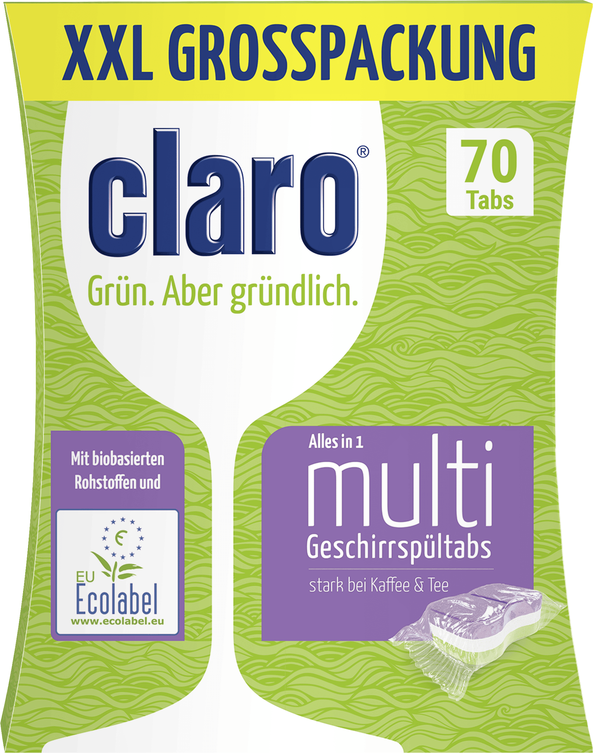 De claro Multi Tabs kombinerar flera funktioner i en tab, så inga ytterligare produkter behövs! De innehåller en salt- och sköljmedelsfunktion och är extremt effektiva mot alla typer av smuts. Tack vare den höga blekmedelshalten tar de även effektivt bort intorkade kaffe- och tefläckar. De innehåller också aktivt syre, en antikalkfunktion och bidrar till maskinhygienen