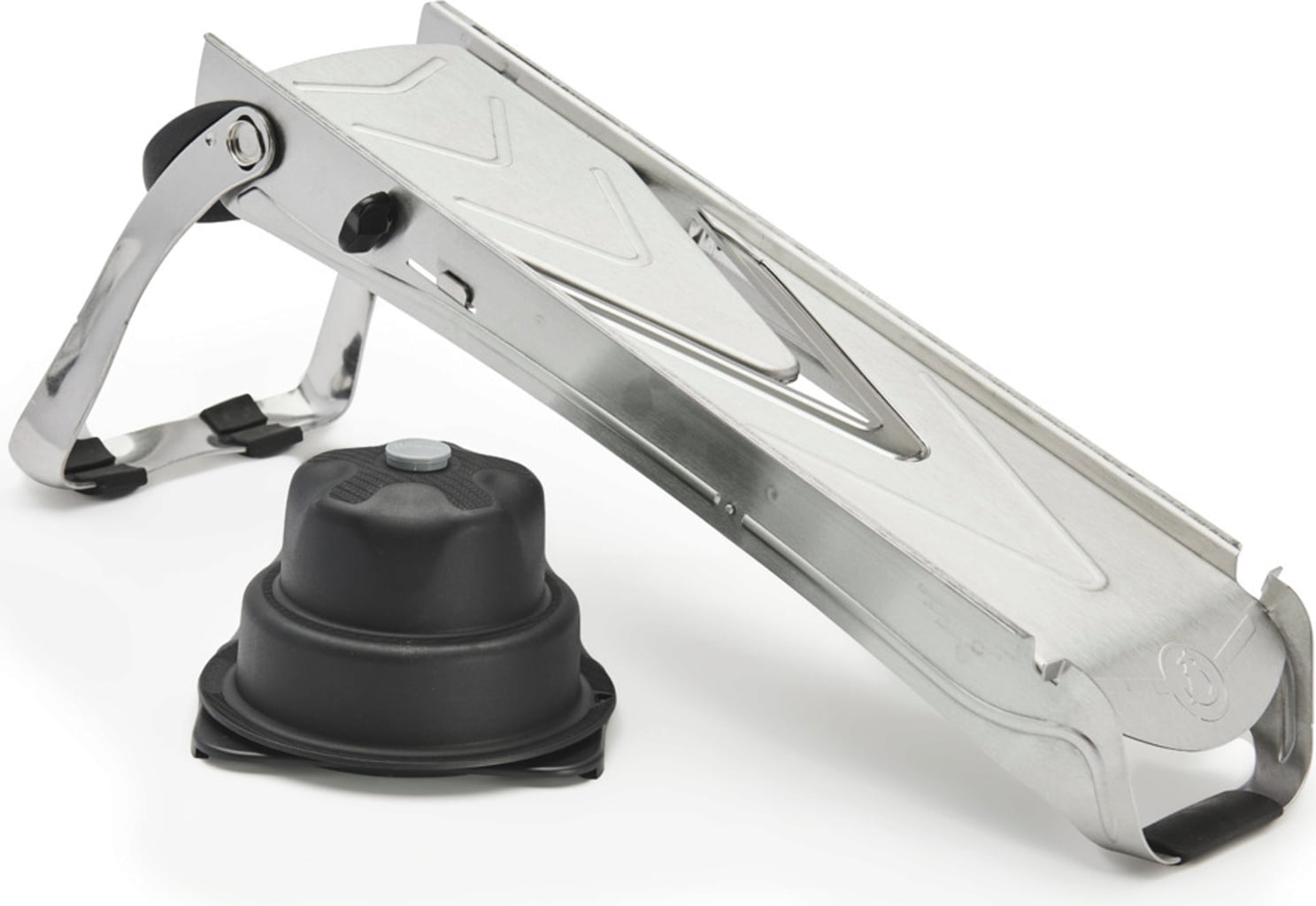 Förvandla frukt och grönsaker till perfekt skurna skivor eller tunna julienne-strimlor på nolltid! Denna smarta mandolin i rostfritt stål har en integrerad V-klinga som enkelt skär igenom allt från mjuka tomater till hårda rotfrukter. Du justerar skivtjockleken från 1 till 10 mm – helt enligt dina önskemål.