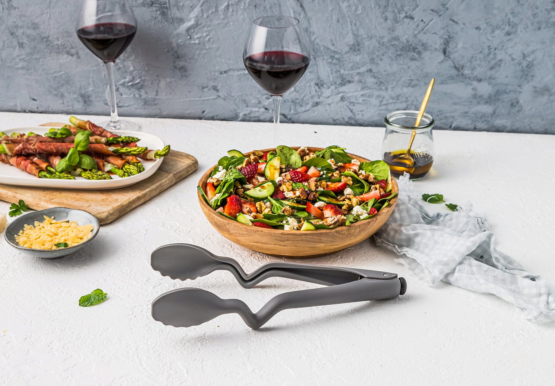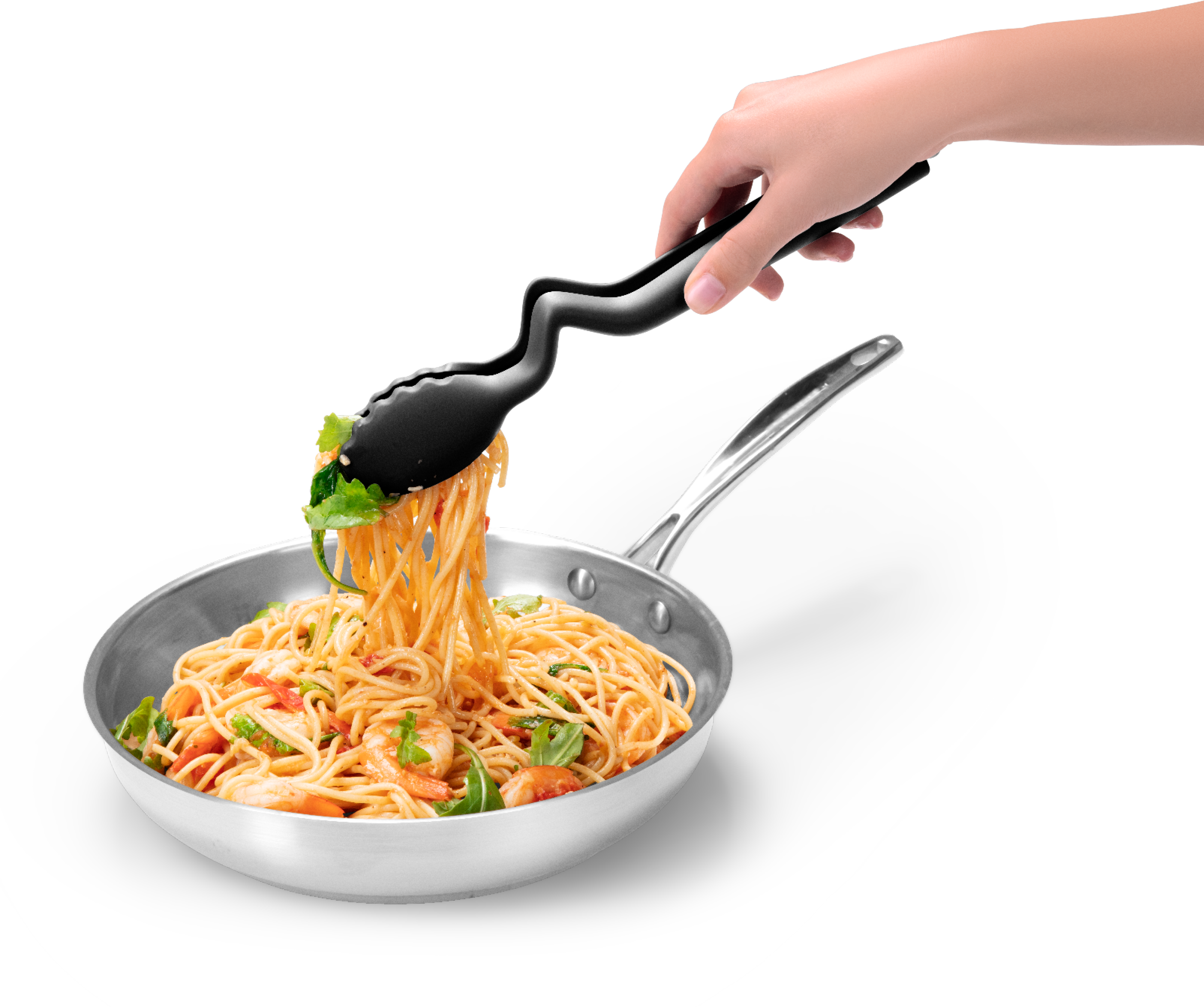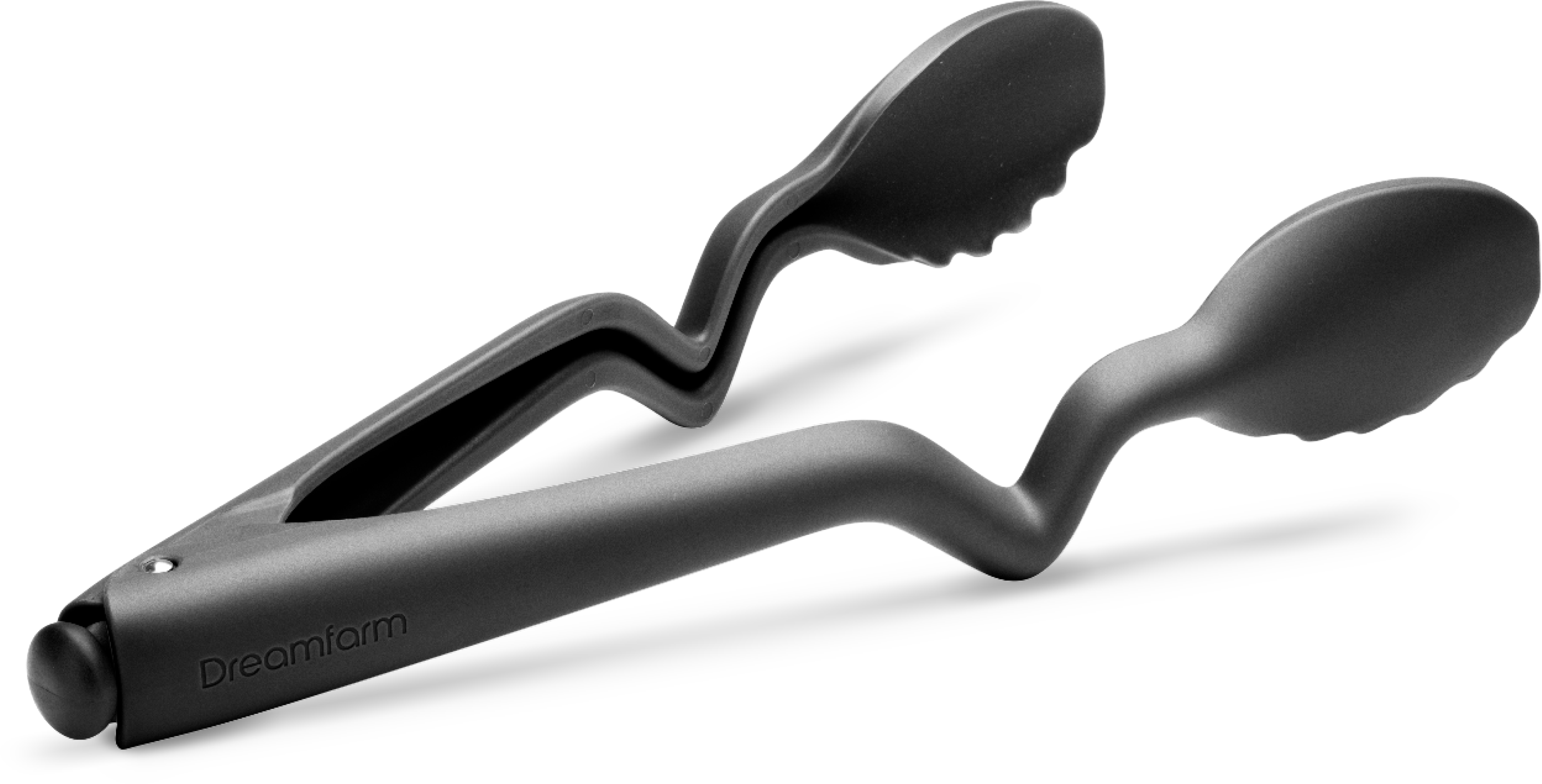 Från och med nu håller du arbetsytan fläckfri under matlagningen. Tack vare den smarta böjen i handtaget svävar tånghuvudena på Clongs Lite från Dreamfarm alltid över ytan eller kan hängas säkert direkt på kastrullkanten. Med det praktiska klicklåset i handtagets ände öppnar och stänger du tången enkelt med en hand via ett knapptryck.