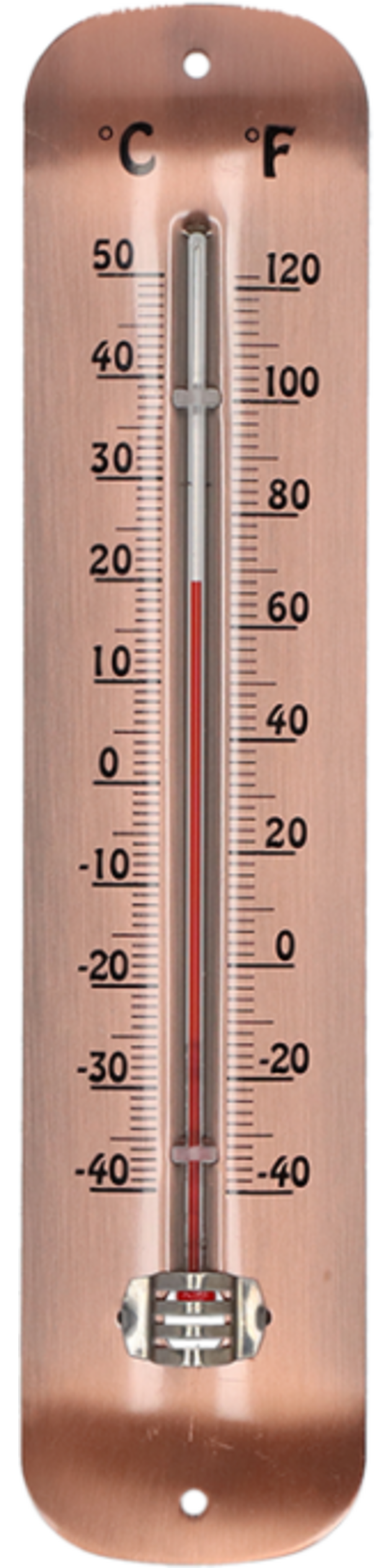Detta kopparfärgade termometer kombinerar elegant design med pålitlig funktion. Perfekt för trädgård, altan eller balkong – visar temperaturen exakt och blir samtidigt en dekorativ detalj tack vare sin metalliska finish. Den robusta konstruktionen klarar väder och vind utan problem.