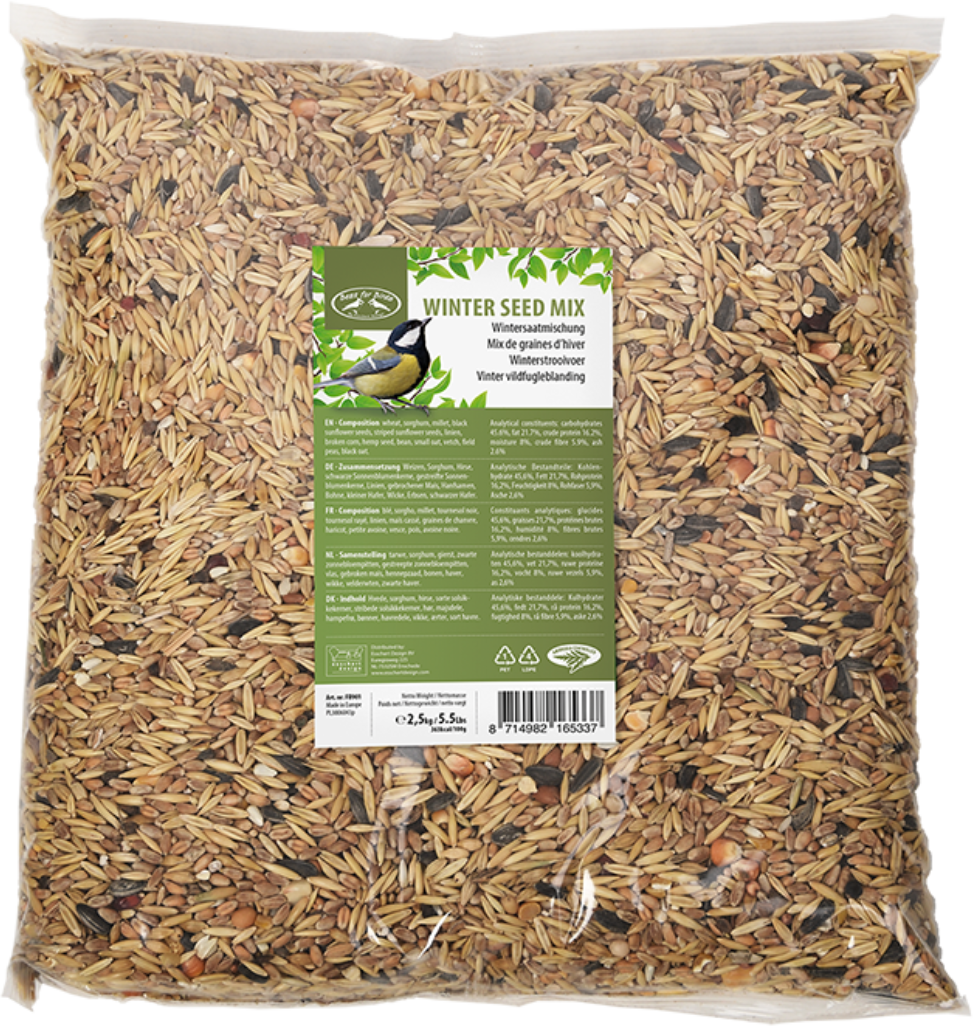 Denna vinterfröblandning består bland annat av vete, hirs, svarta solrosfrön, krossad majs, ärtor och svart havre och är en riktig berikning för fåglarnas kost.