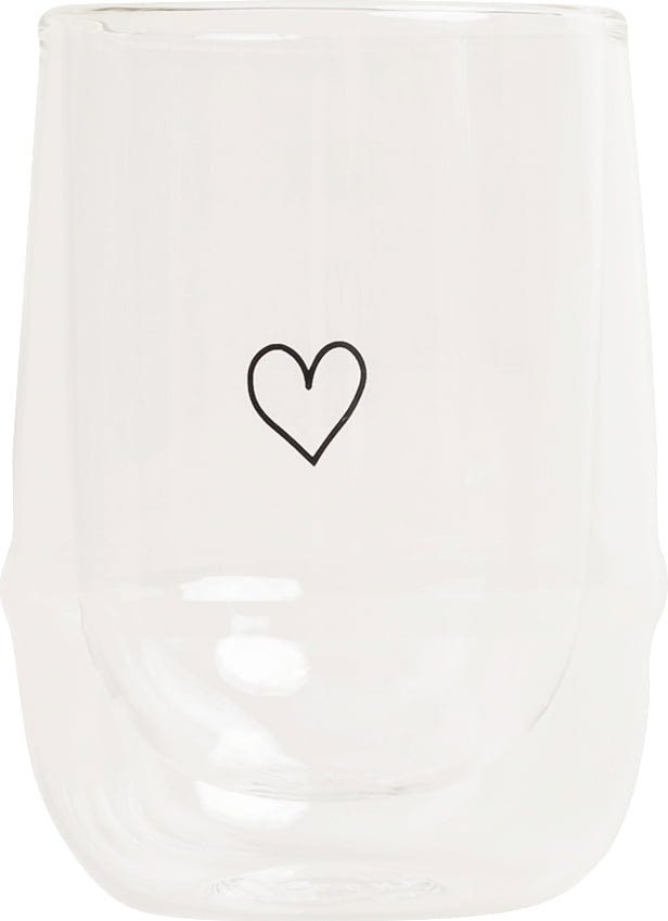 Det dubbellagade glaset med hjärttryck gör varje kaffe- eller testund extra speciell. Den dubbla väggen skapar en svävande effekt och håller samtidigt utsidan sval – perfekt för att skydda händerna. Oavsett om du njuter av en het cappuccino eller en sval iste kombinerar glaset praktisk funktion med stilren design.