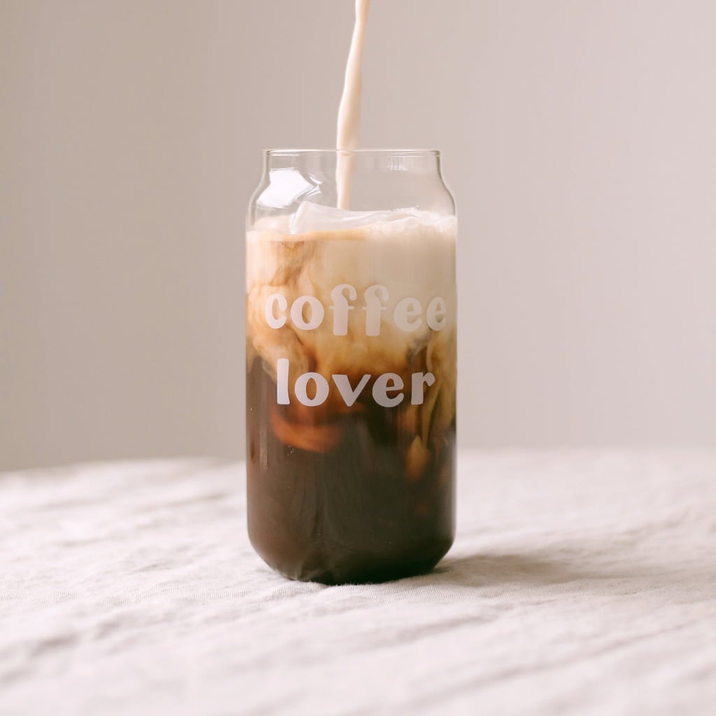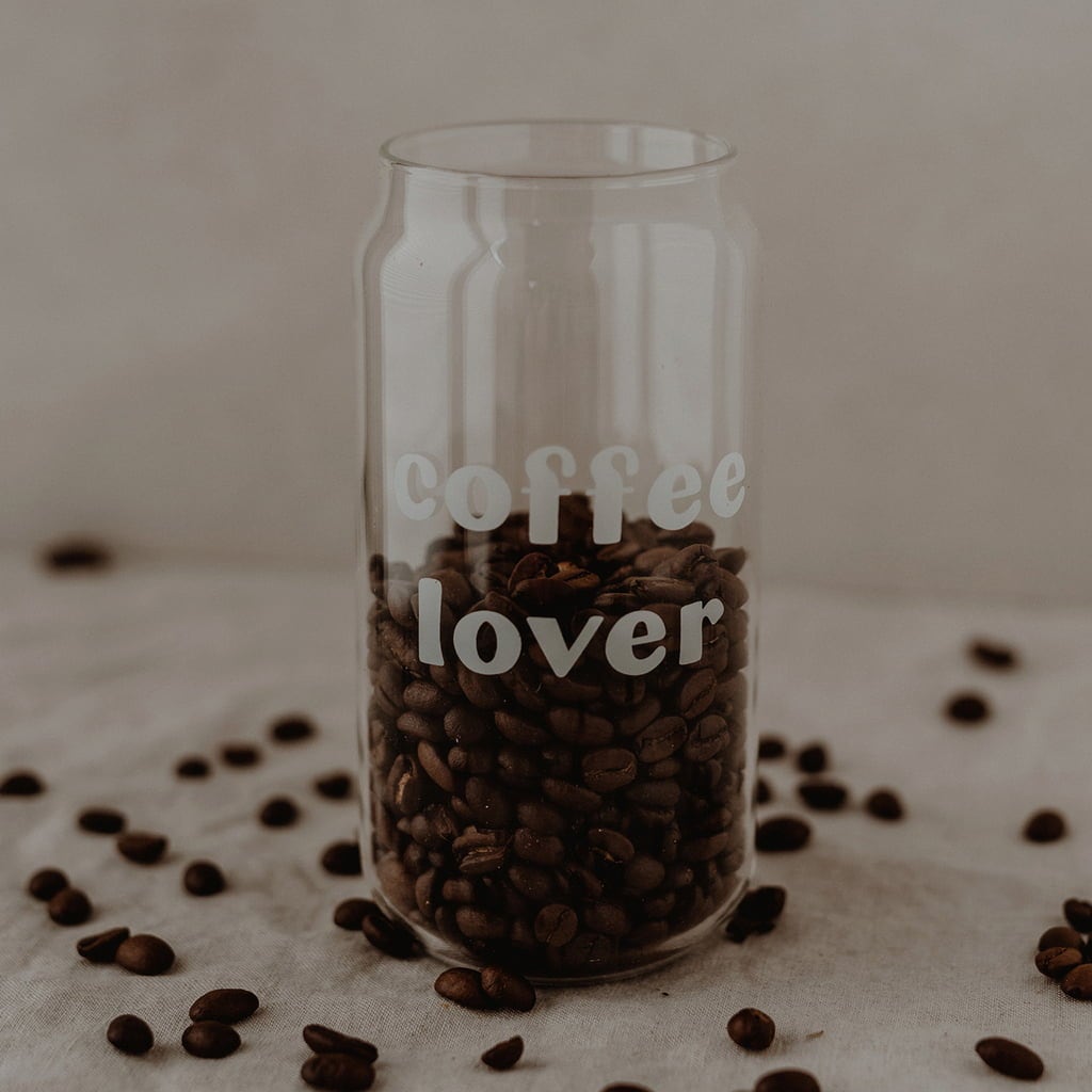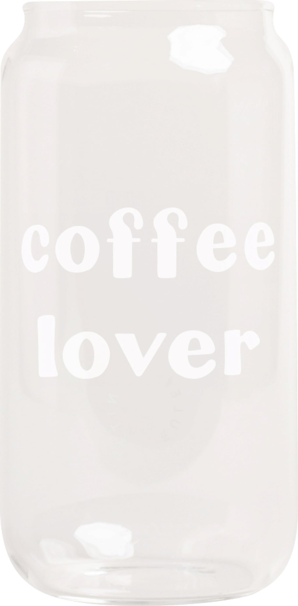 Det höga dricksglaset har en burkform med ett vitt tryck. Ett fantastiskt blickfång för sommardrinkar eller en läcker latte. Dricksglaset är lätt att rengöra i diskmaskinen.