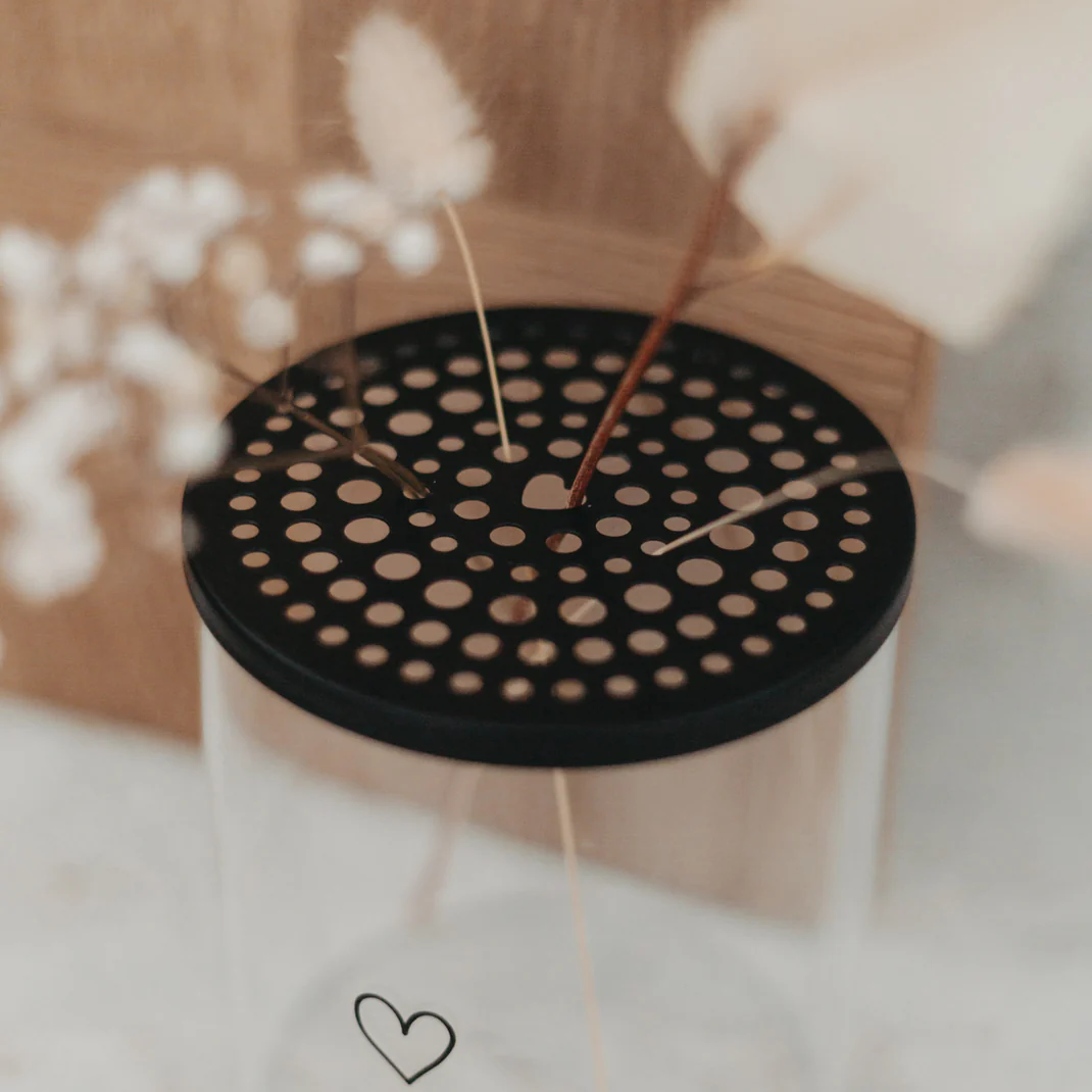 Förvandla en förvaringsburk till en elegant blomvas på ett ögonblick. Den svarta metallocken med blomsterhållare öppnar upp för kreativa arrangemang – från torkade blommor till vårbuketter eller vinterkvistar. Det utskurna lilla hjärtat i mitten ger ett charmigt och kärleksfullt inslag. Minimalistiskt, modernt och ständigt omformbart.