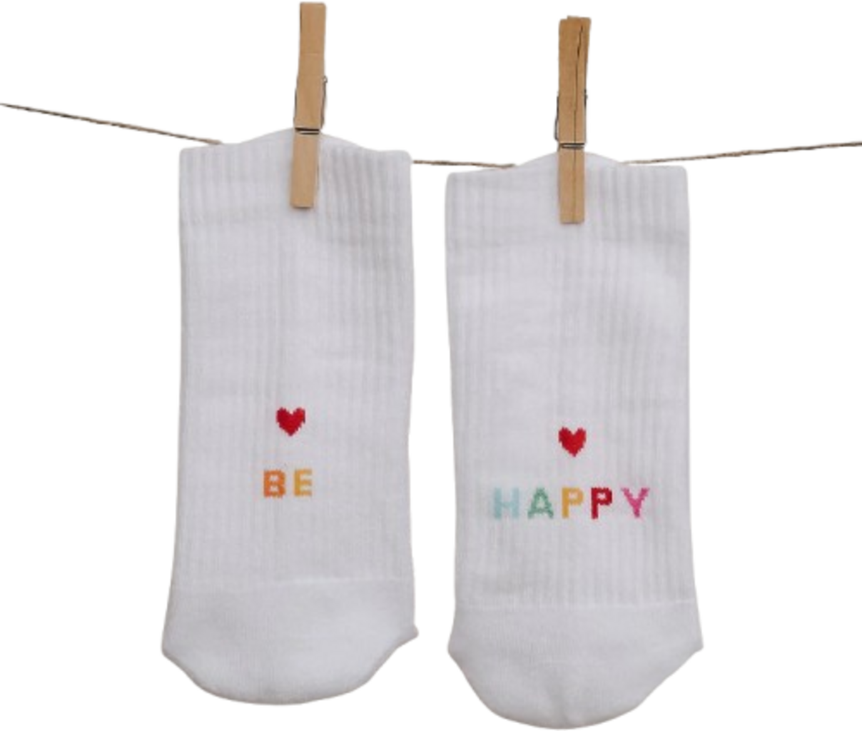 Färgglada, glada och bekväma: De här strumporna med texten ”Be Happy” i regnbågsfärger får både dig och andra att le. Ett riktigt glädjespridande statement som tittar fram avslappnat över dina sneakers.