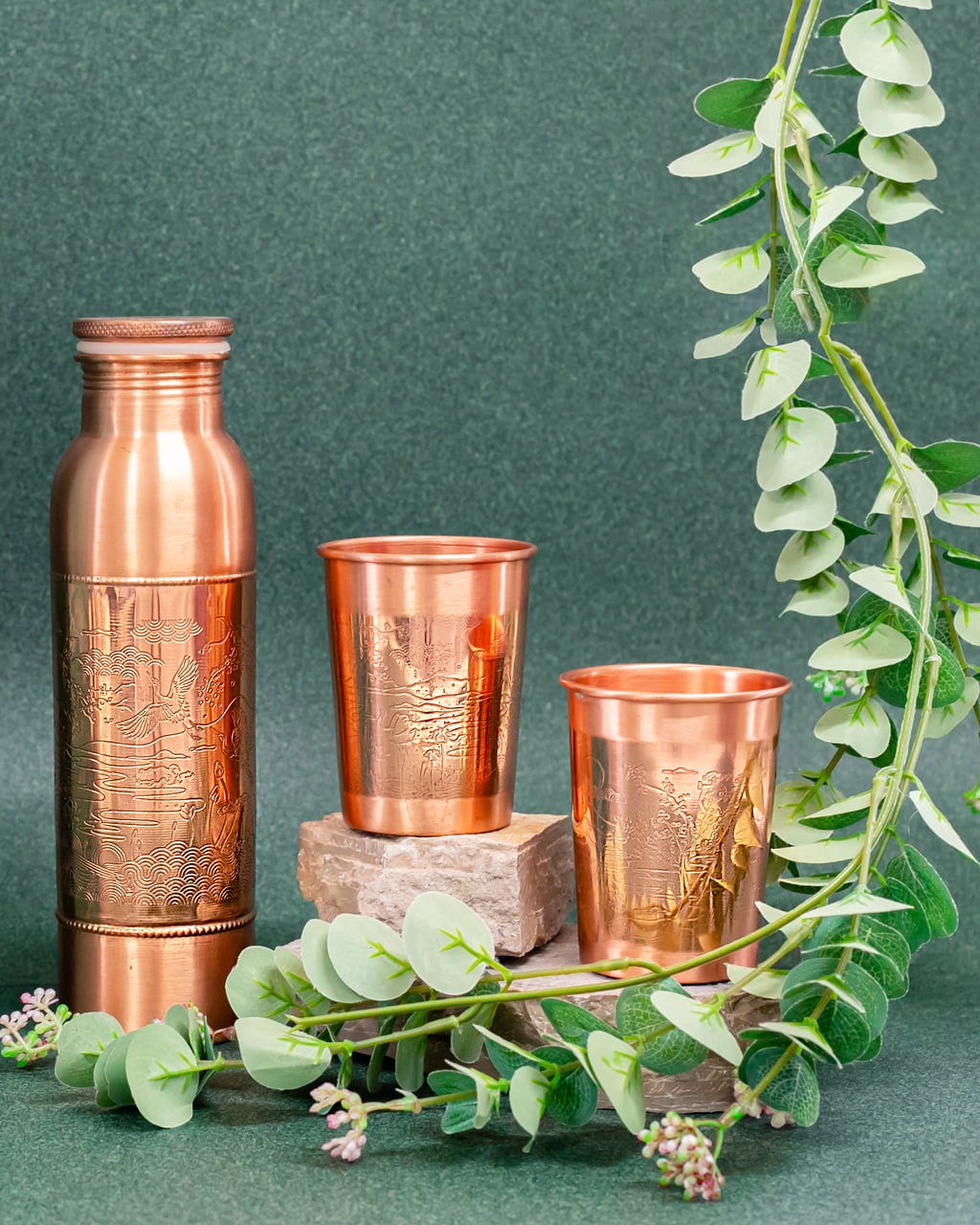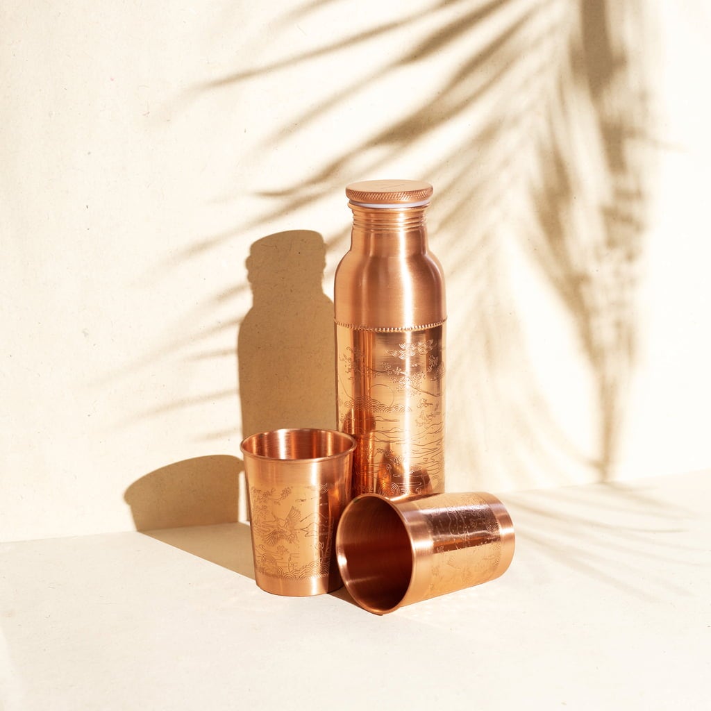 Inspirerad av ett japanskt konstverk och övertygar med sin sköra skönhet av fint graverade blommor och fåglar. Den ädla och hållbara presentuppsättningen kombinerar en idyllisk design med en speciell upplevelse av dricksvatten.