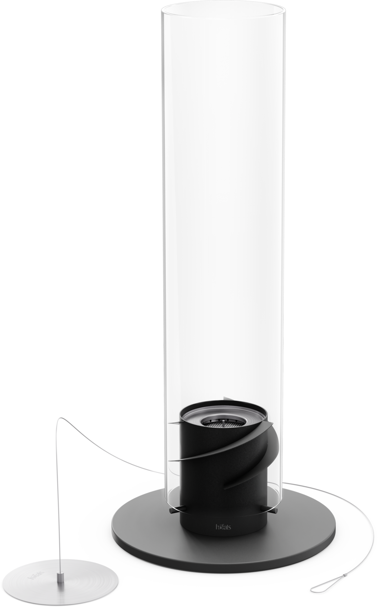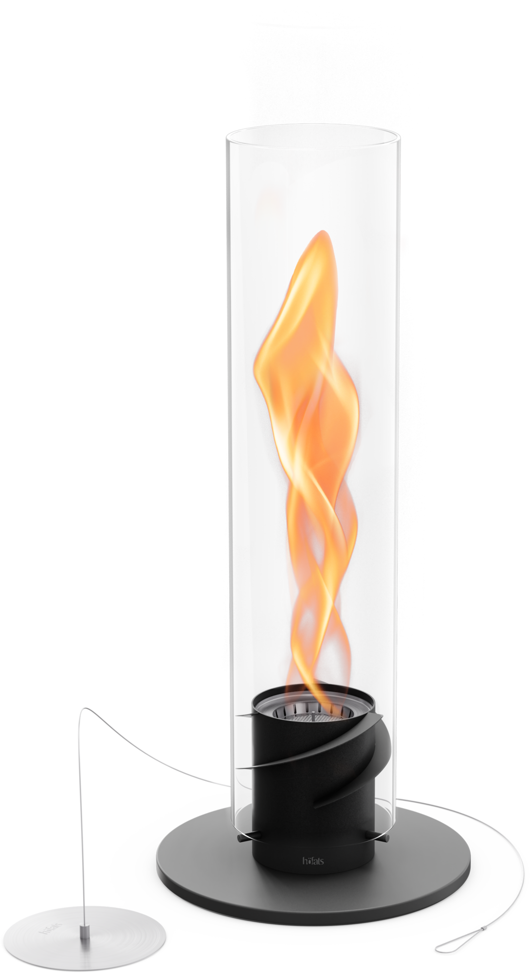 Så fungerar det: Så fort den brinnande gelen har antänts och glascylindern har placerats, får den inkommande luften att rotera via tre blad. Detta skapar en unik termisk effekt som i kombination med glasets skorstenseffekt skapar en säkert innesluten virvel av lågor. Resultatet: lågan växer mer än 500 % högre och fyller hela glascylindern utan att förbruka någon extra energi.