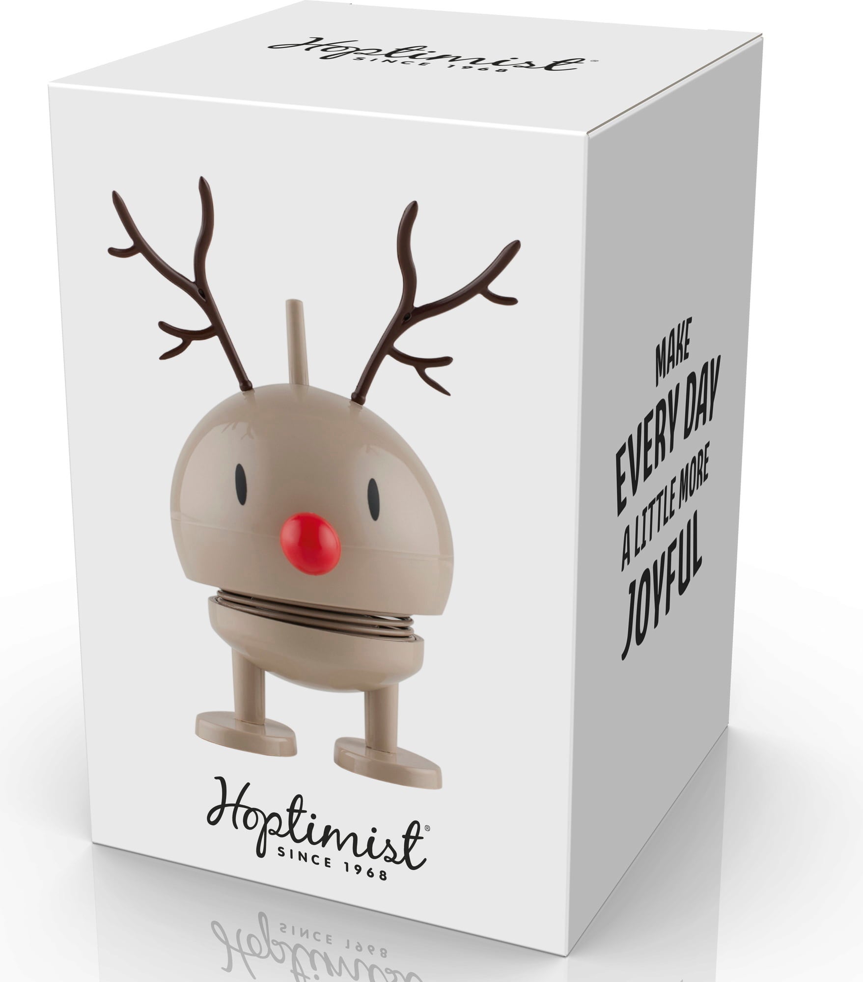 Alla Hoptimister sprider glädje och positiv energi. De söta figurerna med de harmoniskt rundade kropparna finns i många olika utföranden. När man knuffar till en Hoptimist börjar huvudet gunga glatt tack vare den inbyggda stålfjädern. Som gåva vid olika tillfällen sprider de små figurerna mycket gott humör.