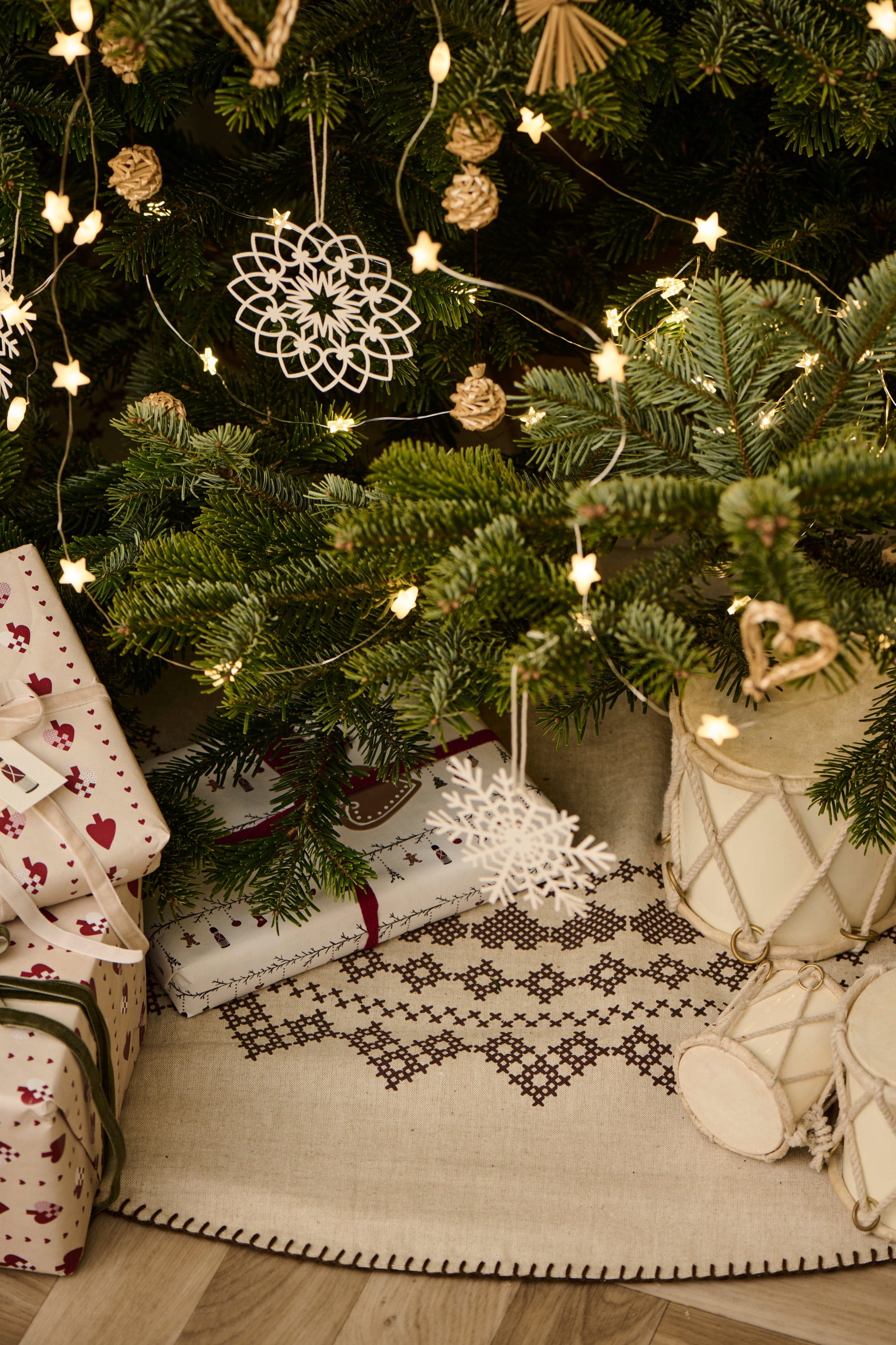 Denna julgransmatta sprider en förtrollande retro-känsla med sin detaljerade broderi och passar perfekt till naturligt dekorerade julgranar. Så skapas en extra stämningsfull jul.
