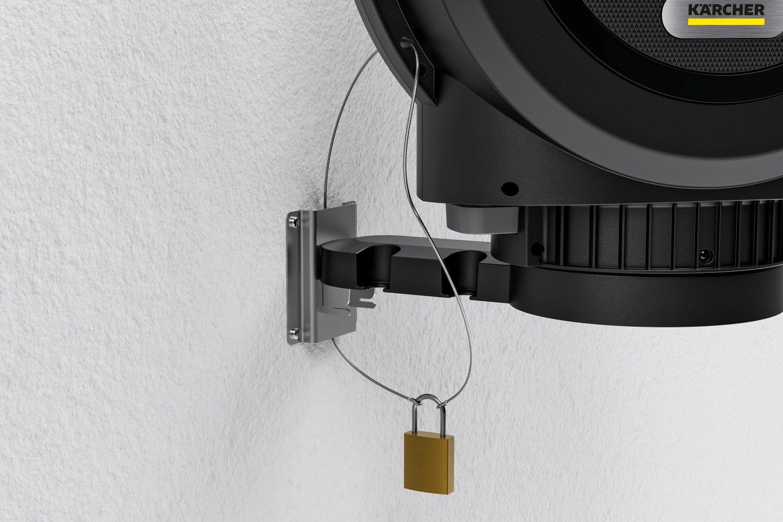 Montering sker platsbesparande på vägg. Den vridbara väggfästet gör att slangvindan kan riktas efter behov så att olika delar av trädgården nås. Slangen låses automatiskt i korta intervaller vid utdragning, vilket gör det enkelt att använda önskad längd.