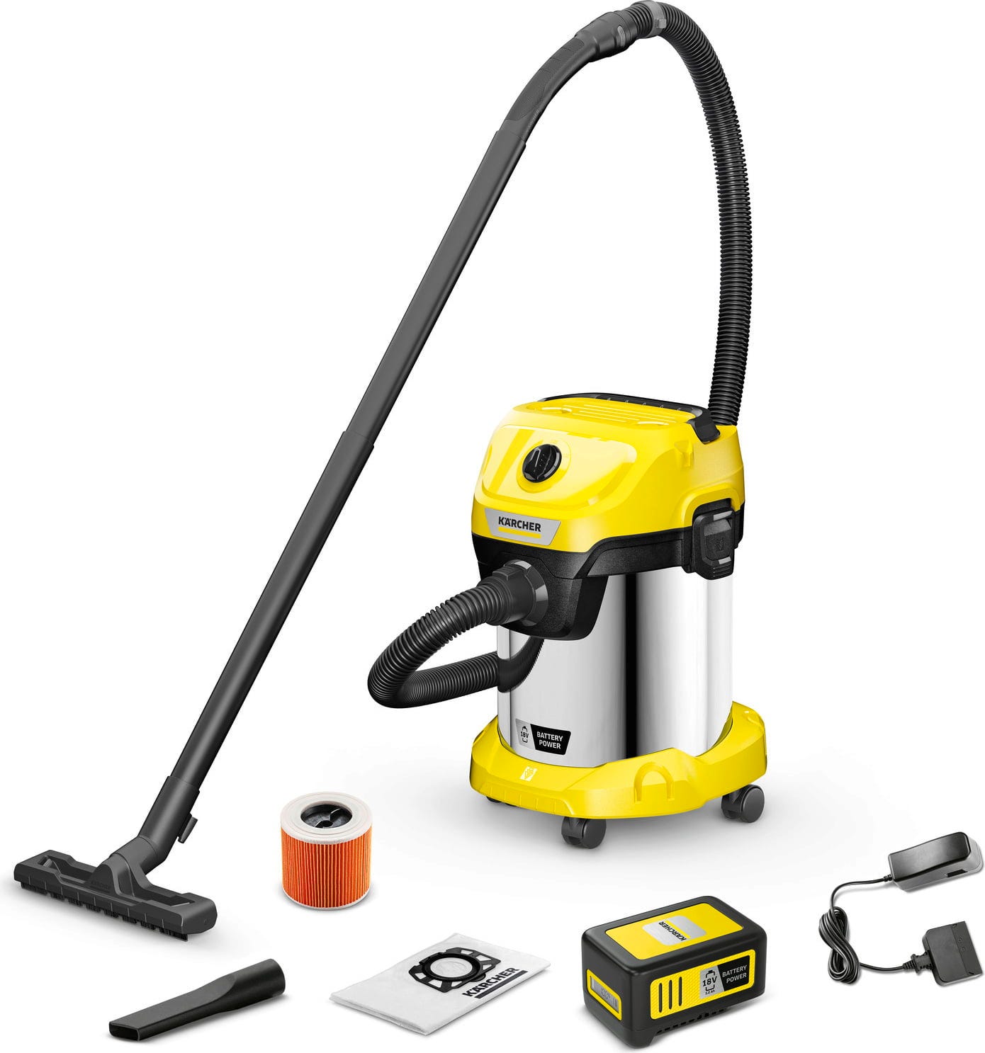 Kärcher WD 3-18 S Battery Set V-17/20 är en kompakt batteridriven våt och torrdammsugare i WD 1 till 3 klassen, perfekt för flexibla rengöringsuppgifter i hemmet, garaget eller källaren. Tack vare 18 V Battery Power plattformen används den utan sladd, vilket gör den praktisk på platser utan el, till exempel på byggarbetsplatser, i trädgårdshus eller på uppfarten.