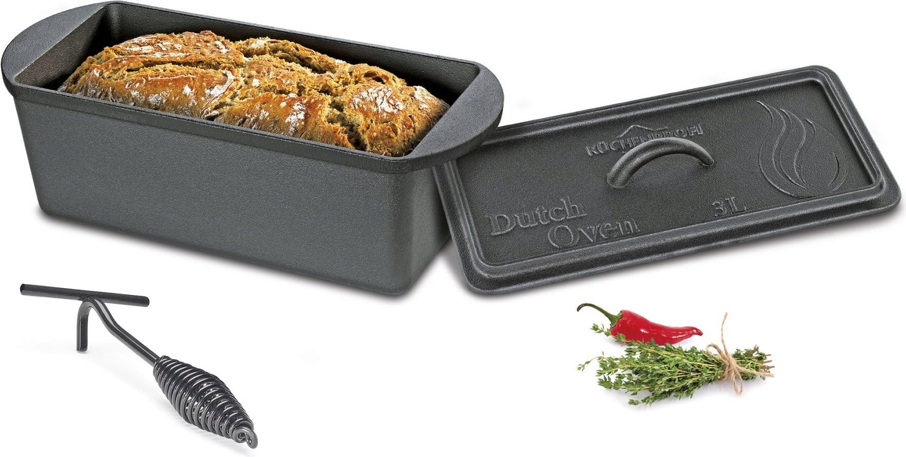 Denna robusta gjutjärnsform med lock passar perfekt för både bröd, kakor, gratänger och stekar - direkt från grillen eller ugnen.