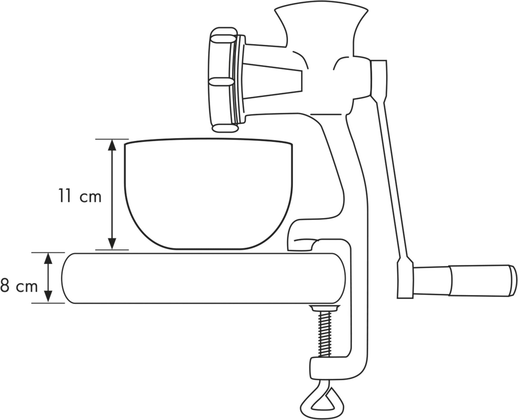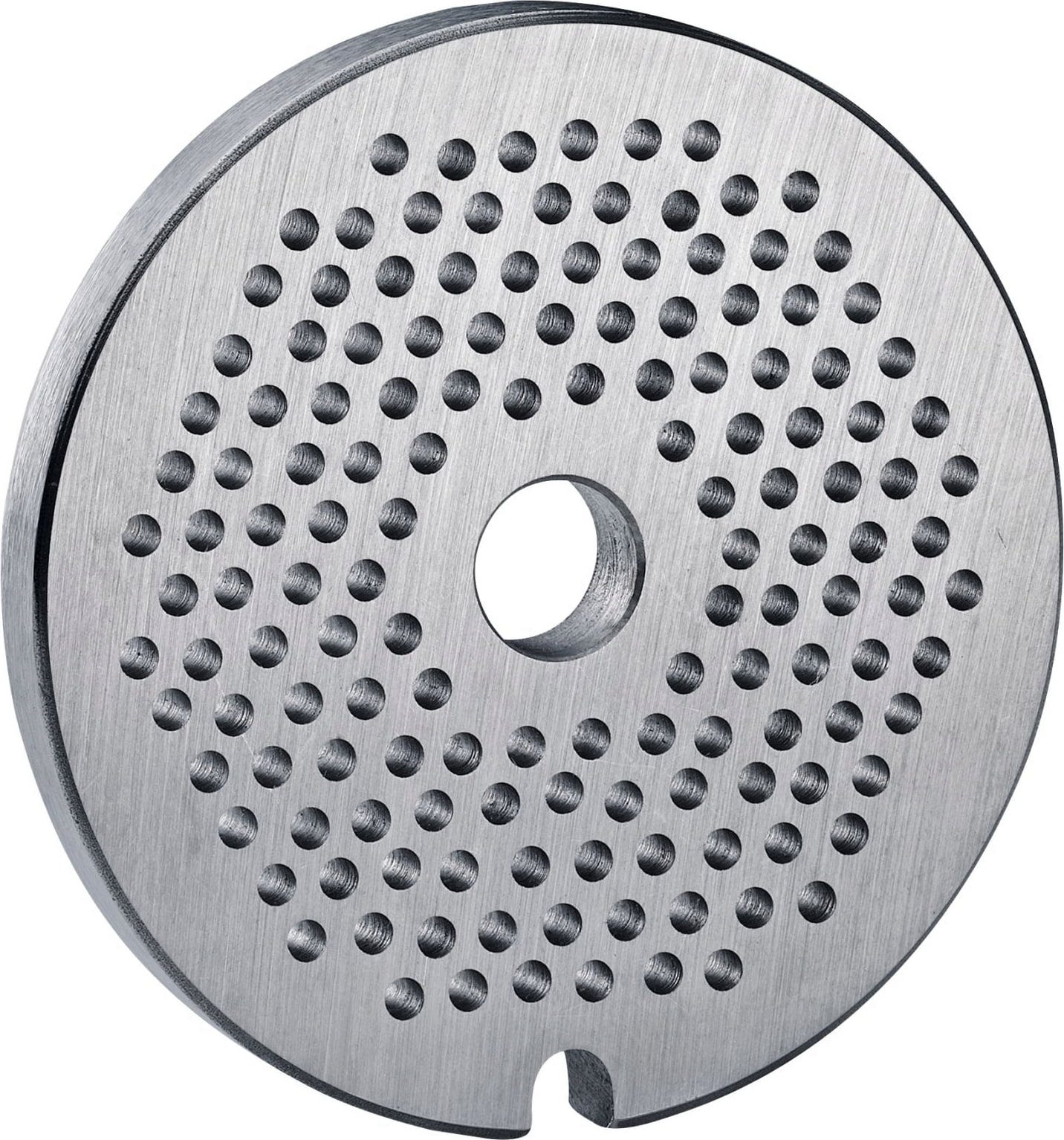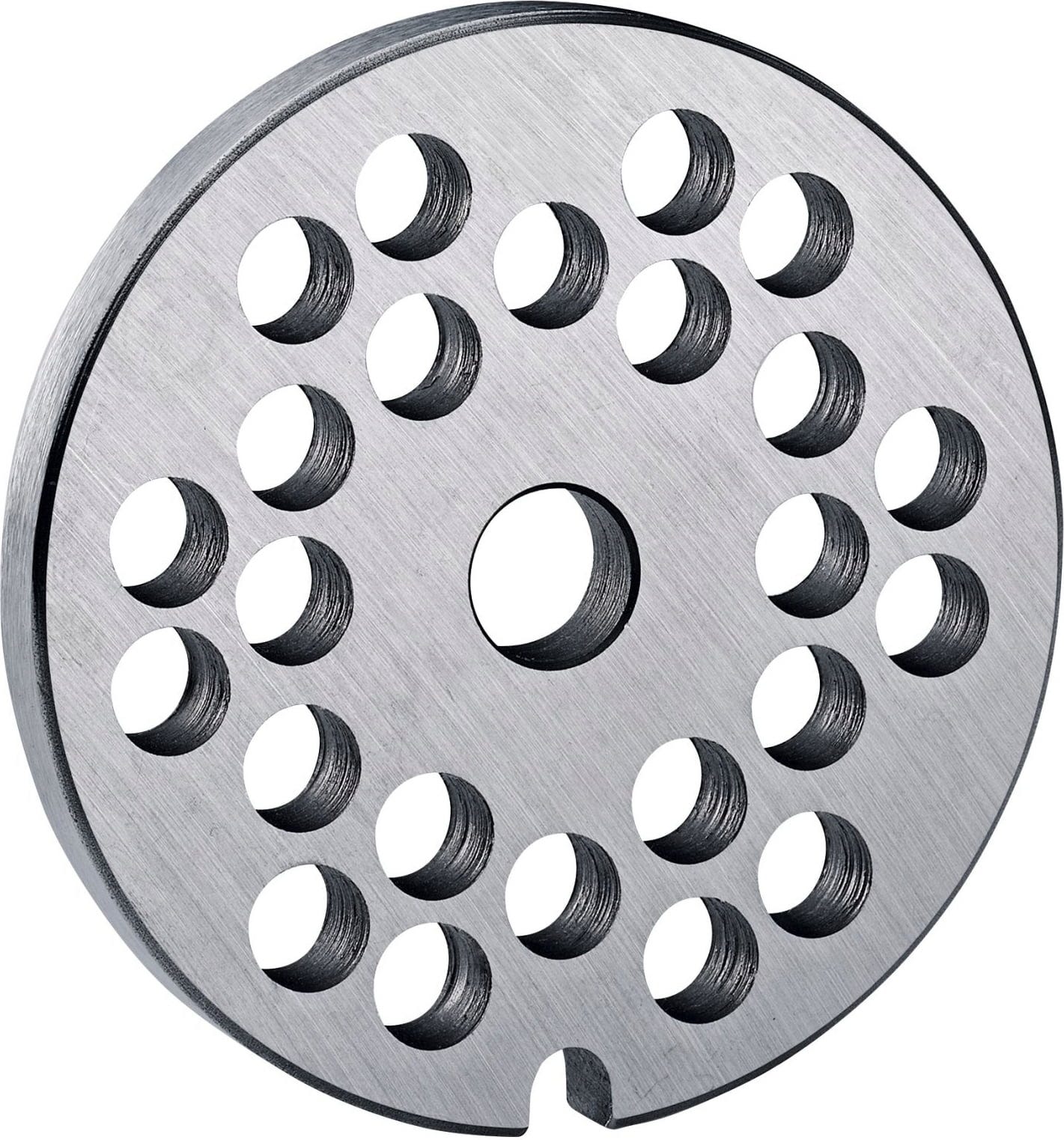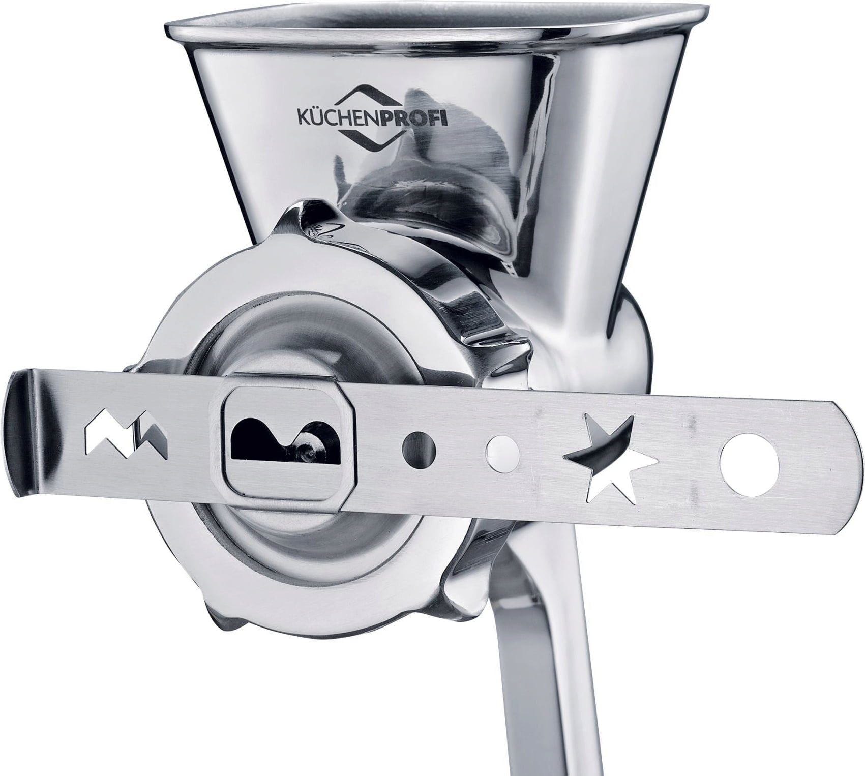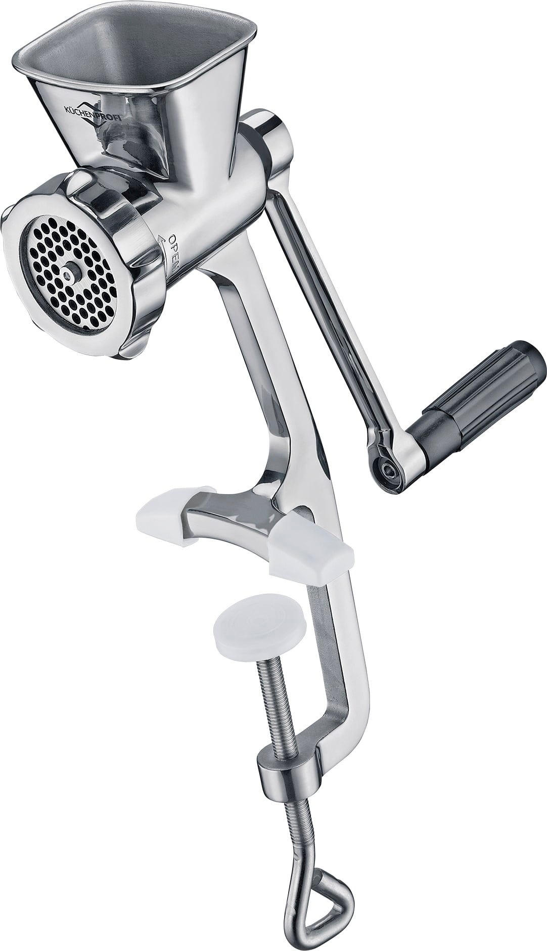 Ingår: Köttkvarn, 3 hålskivor i knivstål (2 / 4,5 / 6 mm), 3 korvhorn (15 / 19 / 23 mm), kakpress med 4 olika formar