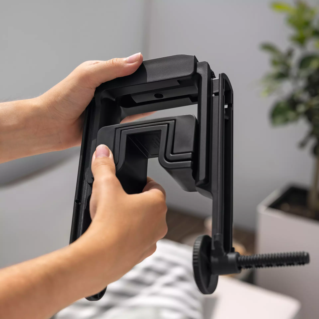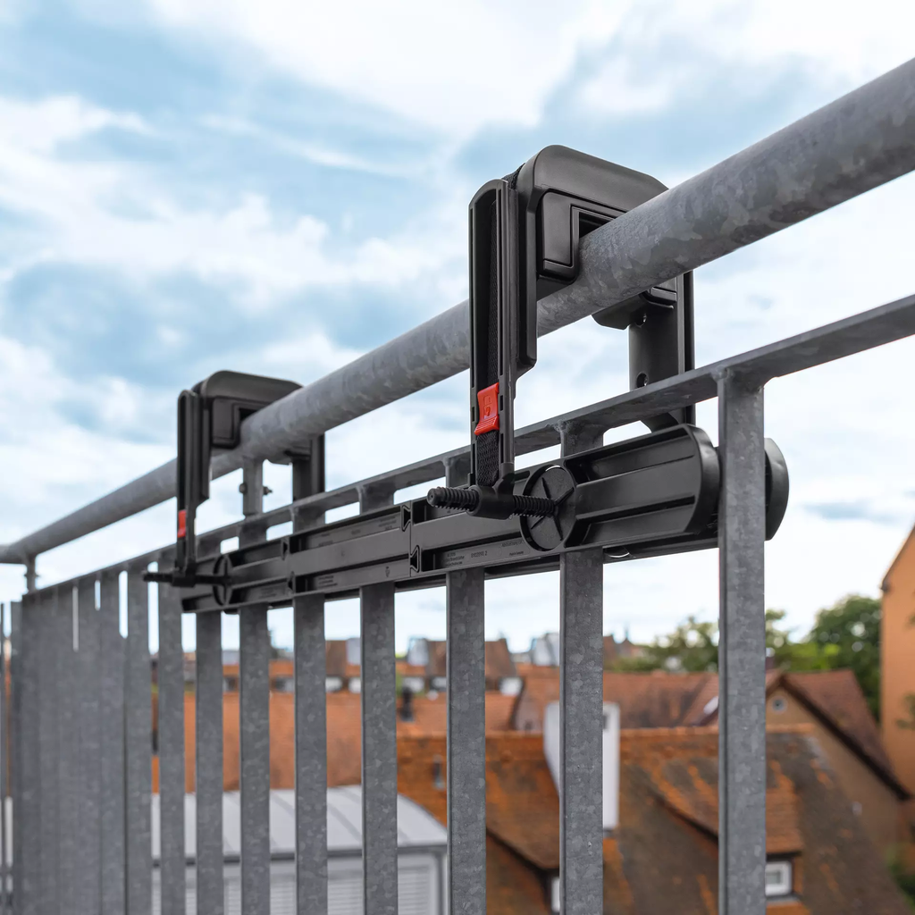 Tips: För räcken med brett avstånd mellan spjälorna rekommenderas ett extra stöd (säljs separat). Detta förhindrar att hållaren glider igenom och ger extra stabilitet.