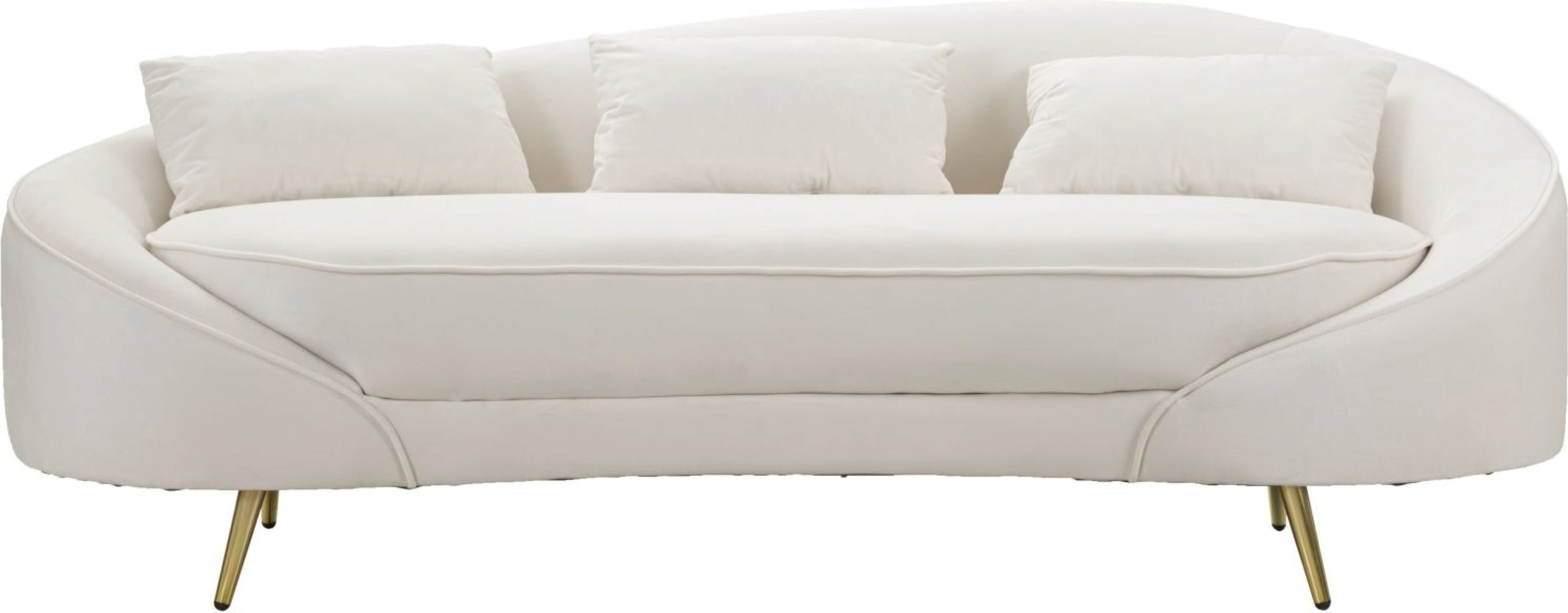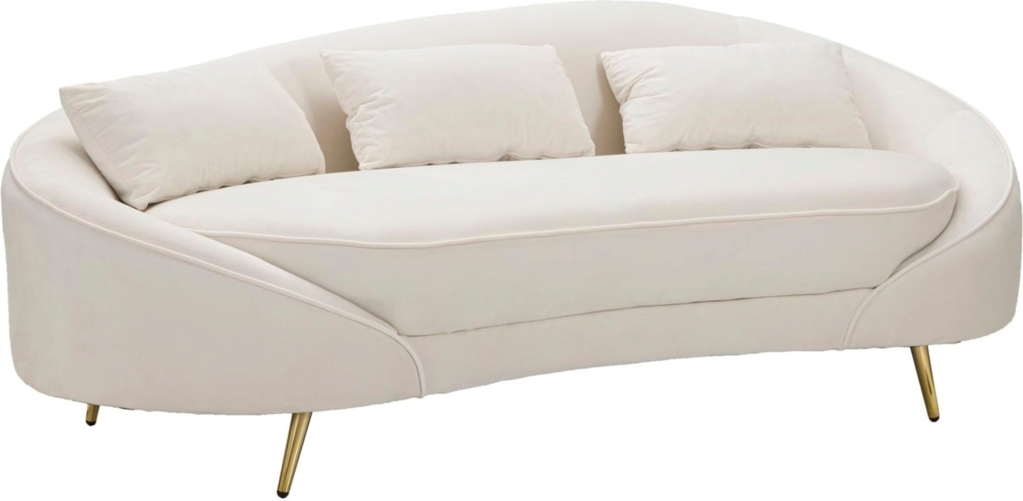 Den moderna designen kompletteras perfekt av eleganta, glänsande guldfärgade metallben, som ger en modern touch och en touch av glamour. Tre matchande kuddar ingår, vilket ytterligare förstärker den exceptionella sittkomforten. Denna soffa är det perfekta tillskottet till moderna, ljusa interiörer som värdesätter design, komfort och en luftig atmosfär.
