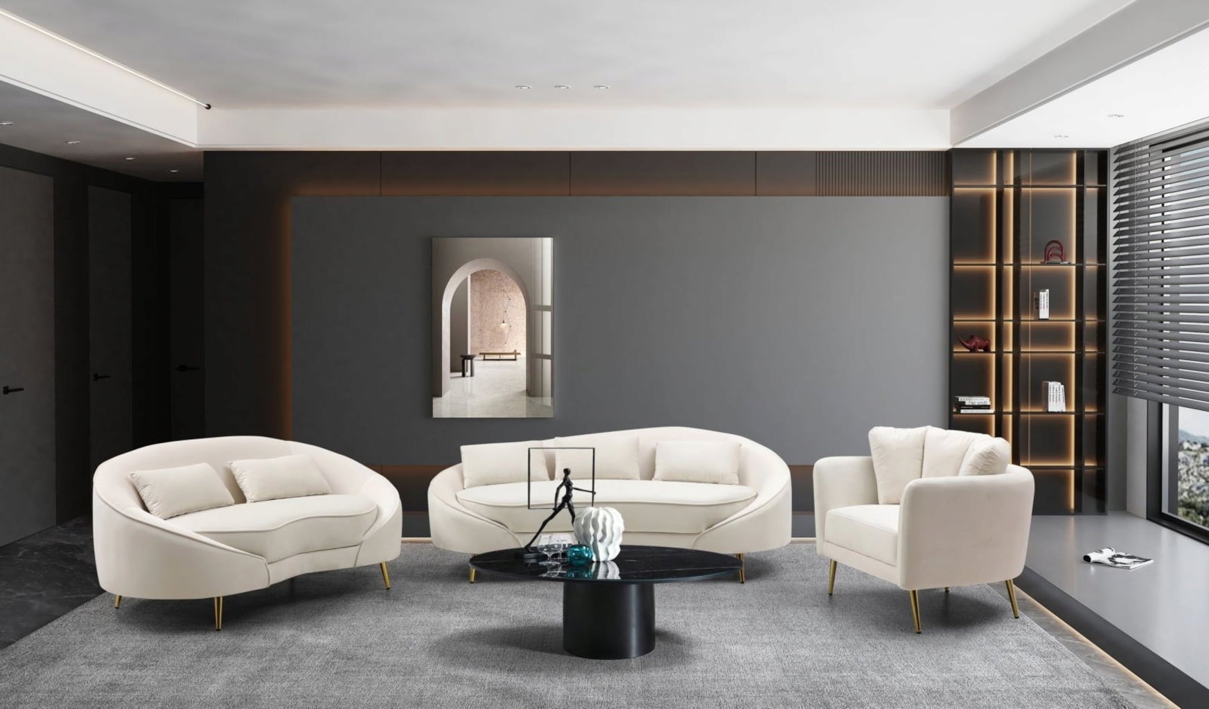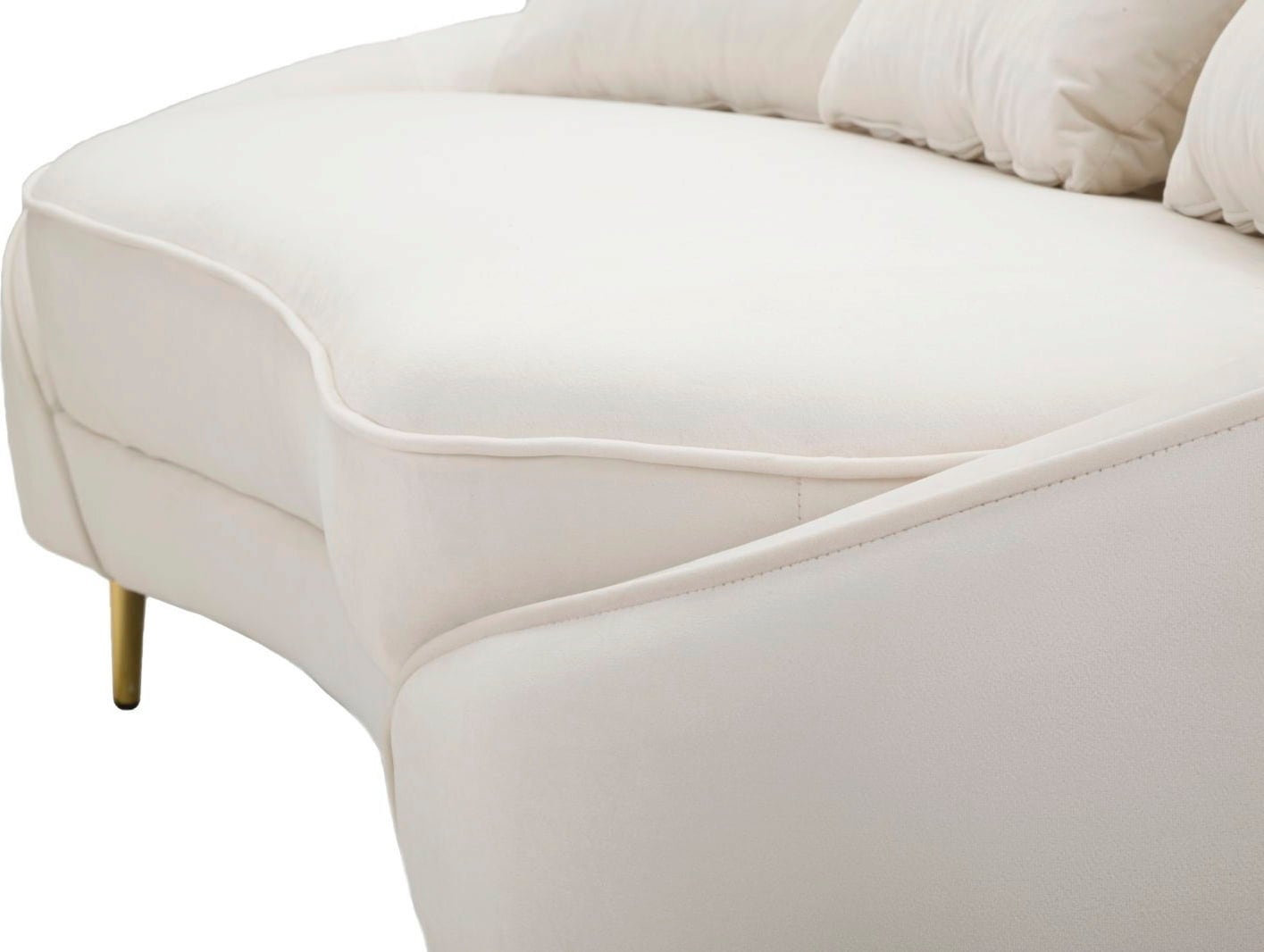 Tillför en touch av elegans, fräschör och lyxig komfort till ditt vardagsrum med denna eleganta tresitssoffa! Den lyxiga, mjuka klädseln i en ljus krämfärgad ton och de mjuka, inbjudande linjerna i den böjda, asymmetriska formen skapar en slående blickfångare.