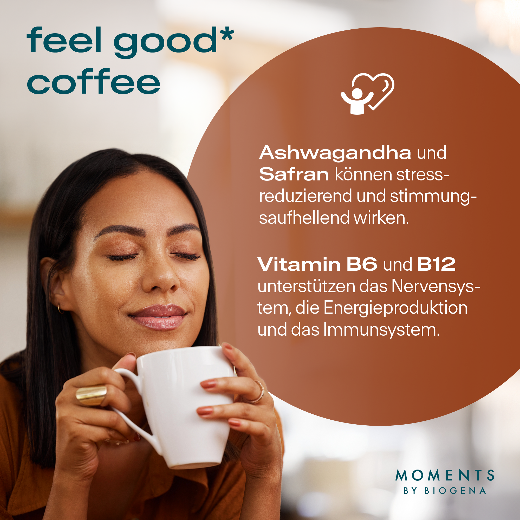 feel good* coffee med ashwagandha, saffran, vitamin B6 och B12 erbjuder en högkvalitativ uppgradering av den dagliga kafferitualen. Smaken är kompromisslöst unik och sammansättningen högkvalitativ, medan hanteringen förblir särskilt bekväm.