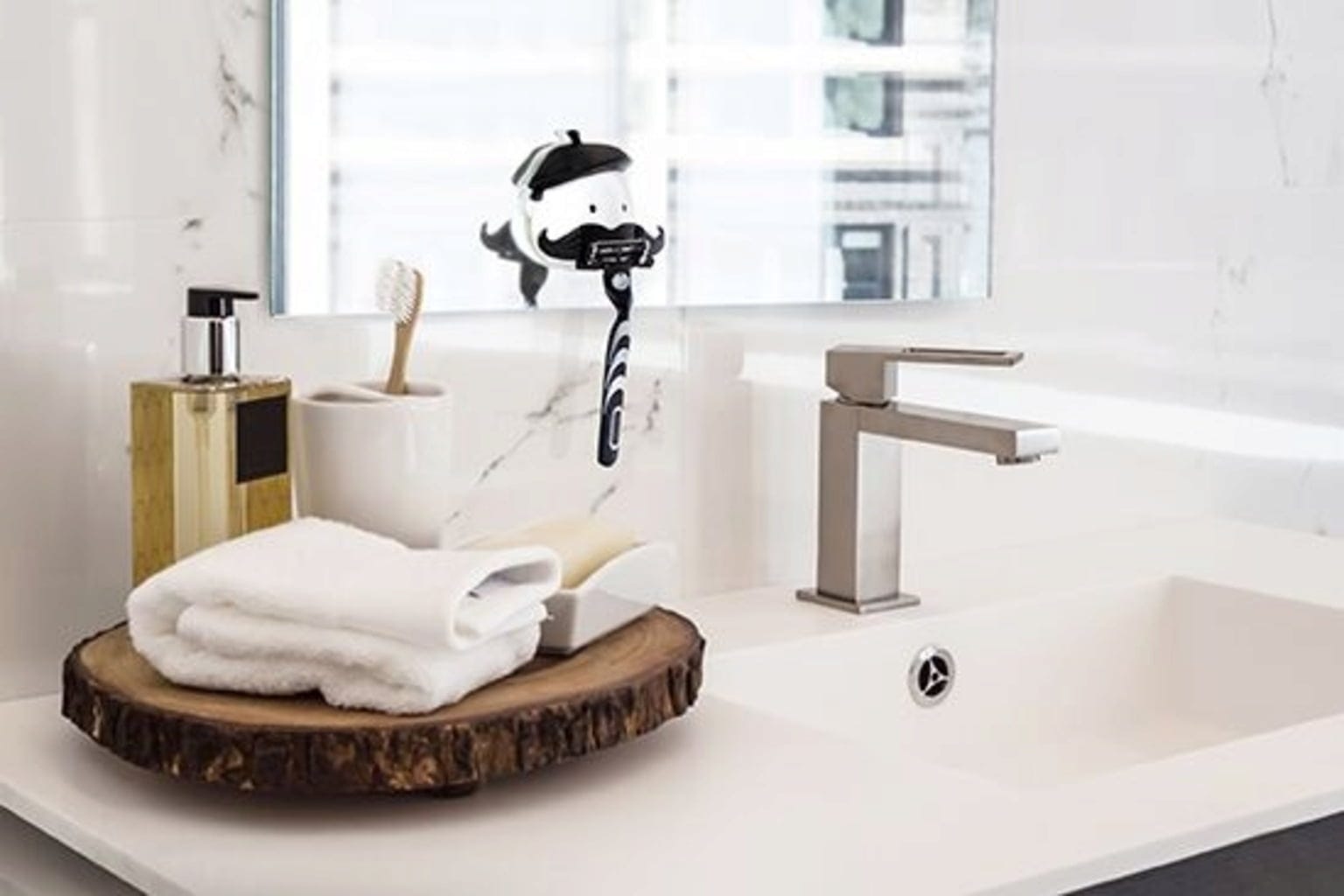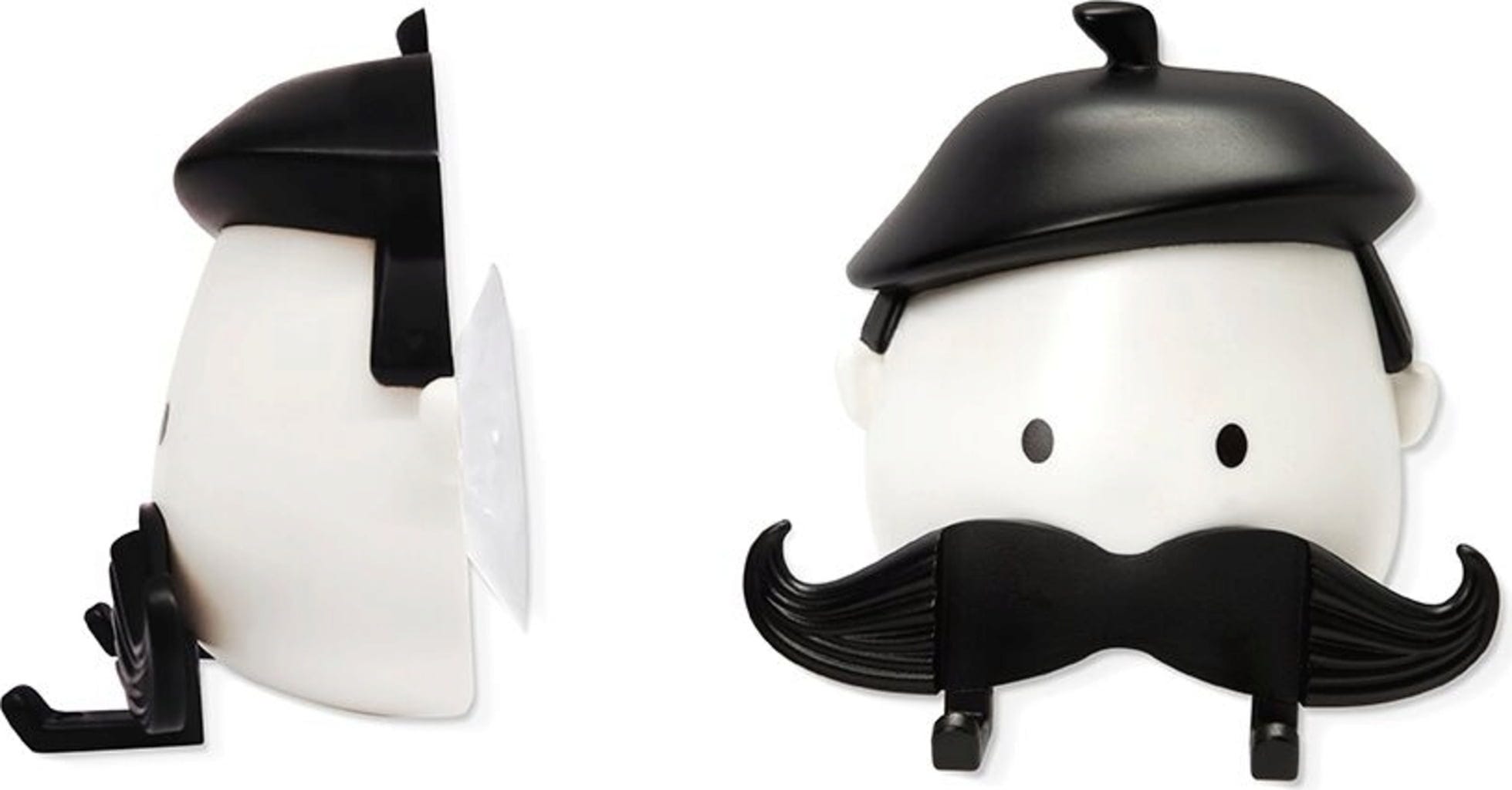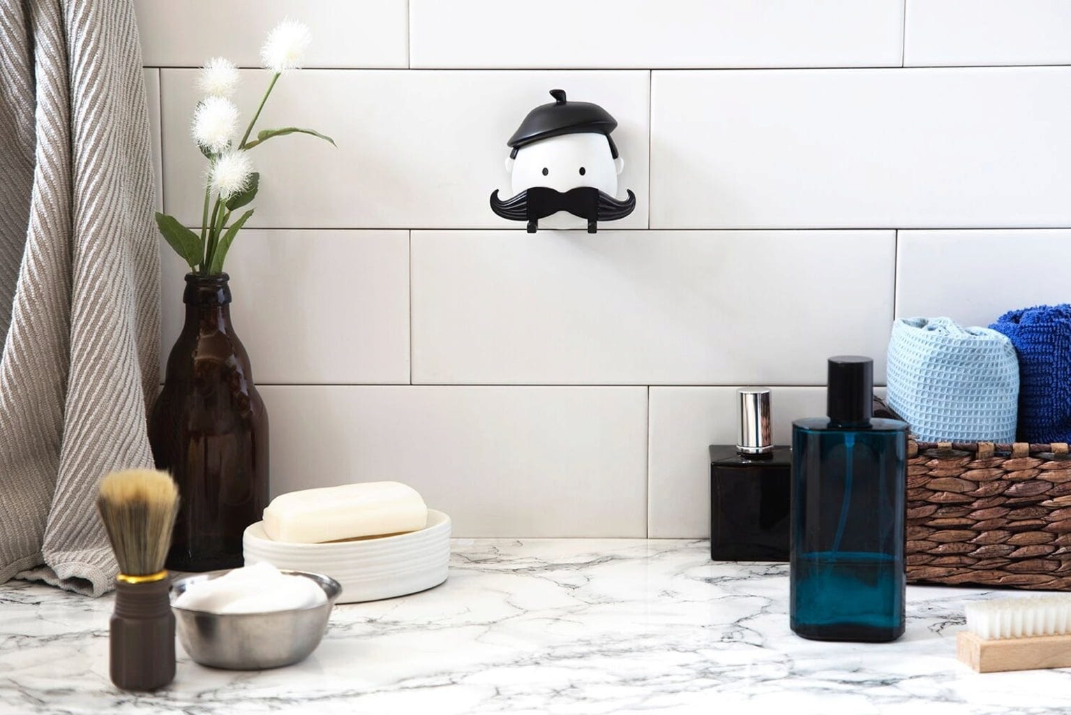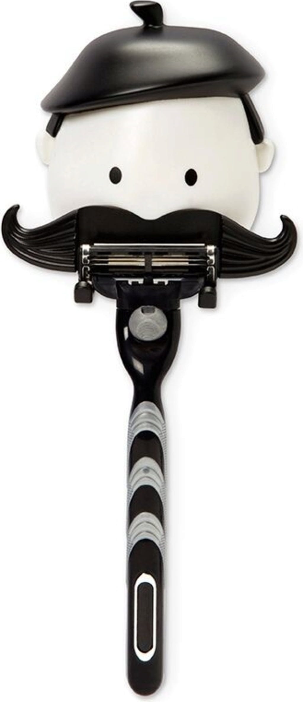Denna eleganta gentleman håller rakhyveln där den hör hemma - på en välvårdad mustasch. Tack vare sugkoppen håller Mr Razor fast vid kakel och spegel. För ren och säker förvaring av rakhyvlar.