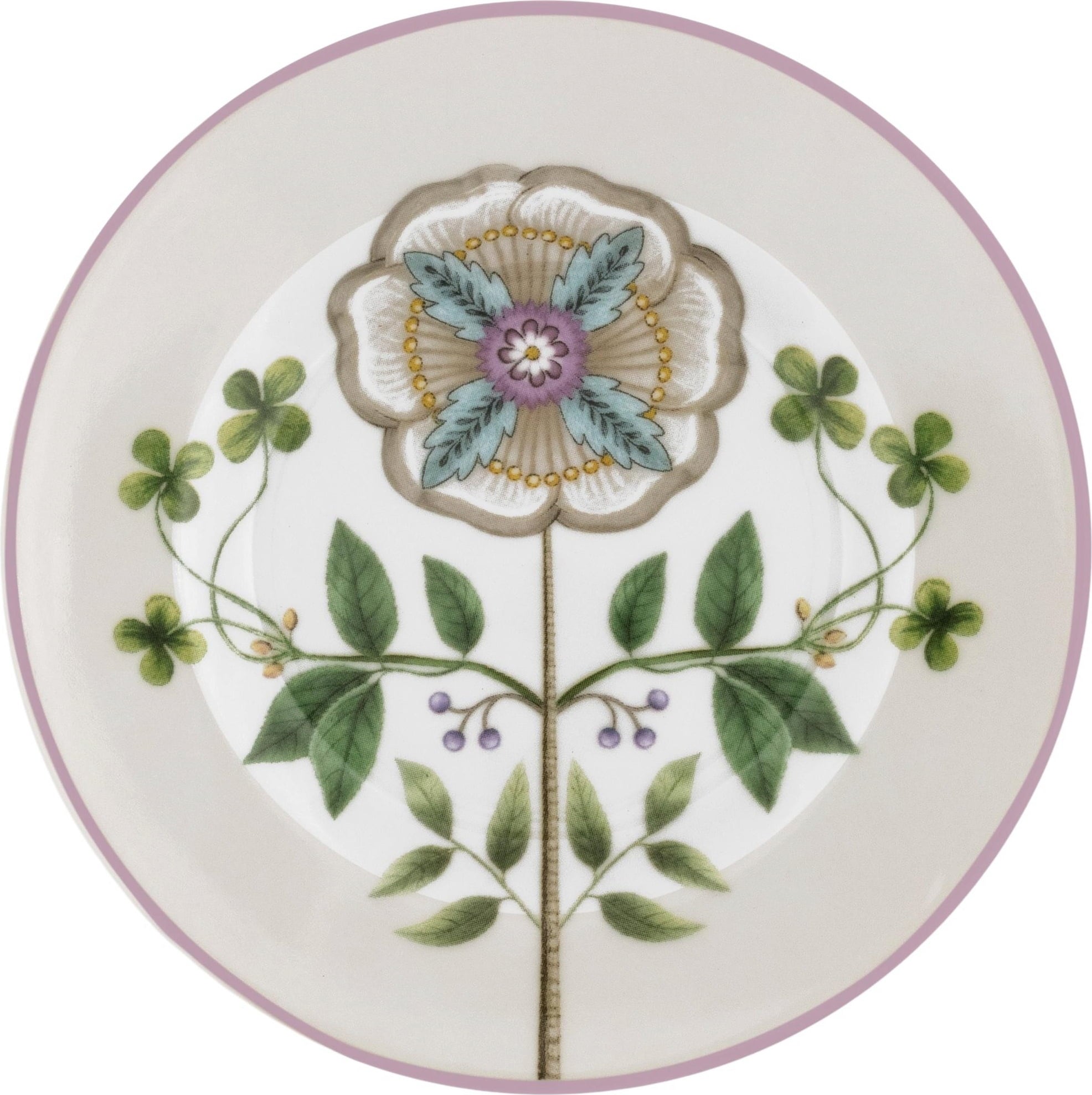 Assietten är dekorerad med en stor, fantasifull lilja i mjuka pastelltoner som utgör designens mittpunkt. Blommorna och de dekorativa bladen ramar vackert in motivet och ger assietten en modern men tidlös känsla.