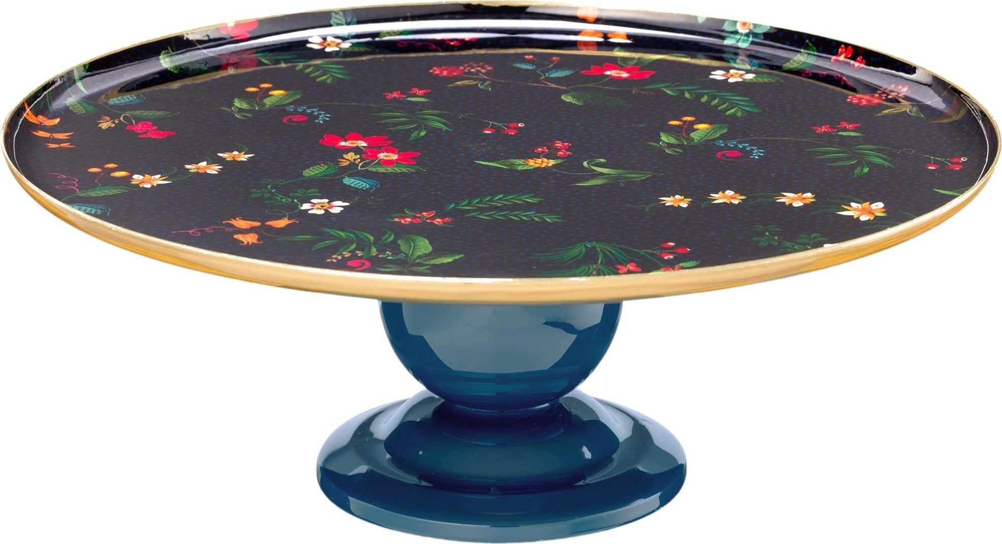 Den stabila foten är i en glänsande marinblå färg som harmoniserar med plattans grundton och ger ett enhetligt intryck. Tillverkat av metall är detta tårtfat robust och hållbart. Det fungerar även perfekt som dekorativ presentationsyta för frukt eller små snacks.