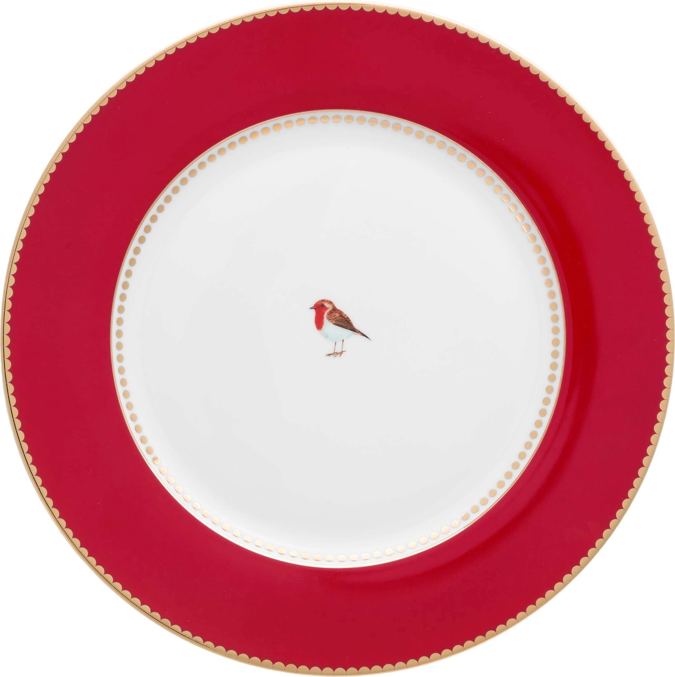 Med dessa charmiga tallrikar från Pip Studio skapar du en vackert dukad bordsmiljö! En djupröd kant samt gyllene detaljer ramar in den söta rödhaken i mitten och ger designen en elegant men lekfull känsla. Tillverkad av fint porslin blir tallriken en stilfull blickfångare på bordet och kan enkelt kombineras med andra produkter ur Love Birds-kollektionen!
