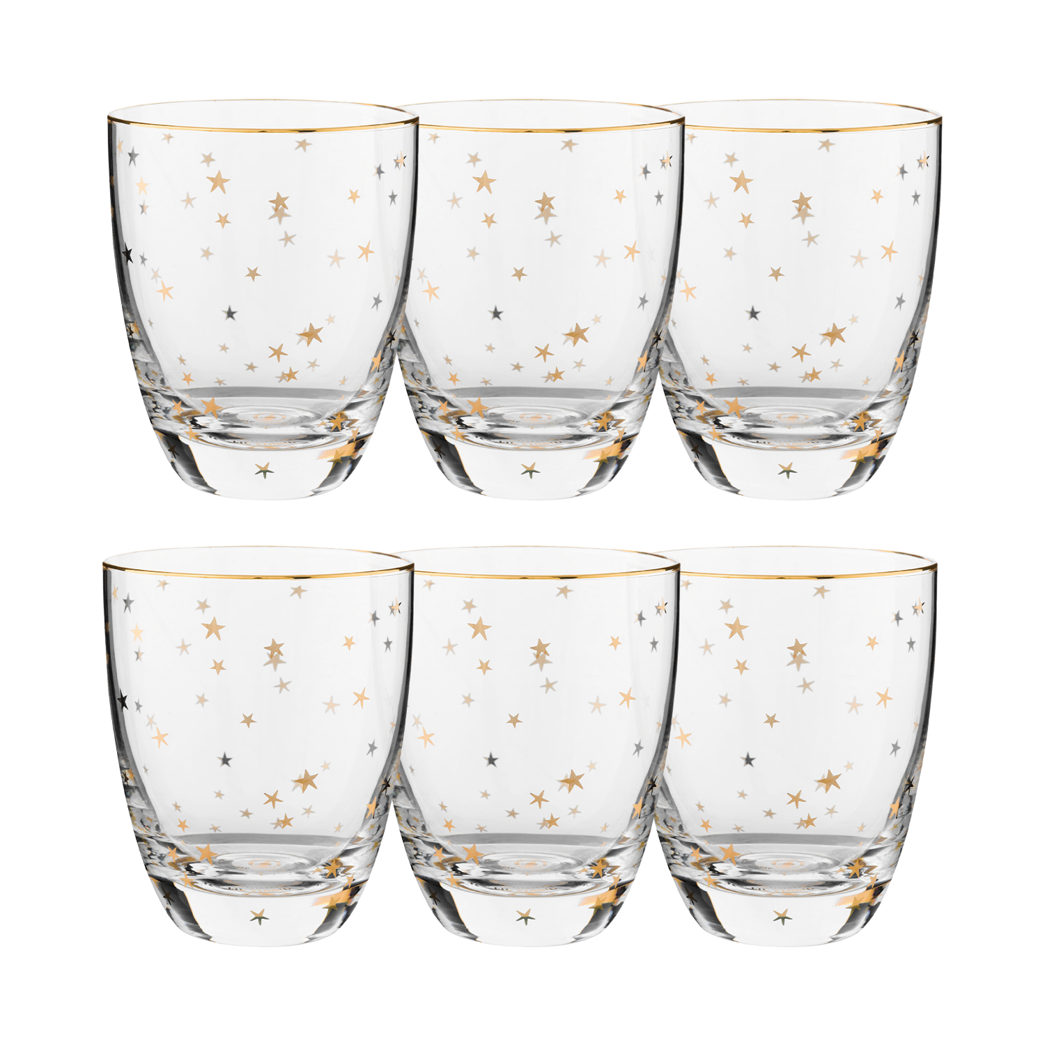 Låt dina drycker glänsa med stil i detta vackra vattenglas från Pip Studio! Glaset är tillverkat av klart, högkvalitativt glas och dekorerat med fina stjärnor i guld och silver. En tunn guldkant sätter en lyxig accent. Den eleganta formen och den förstärkta bottnen gör glaset till ett riktigt blickfång. Det har dessutom en generös volym på 350 ml.