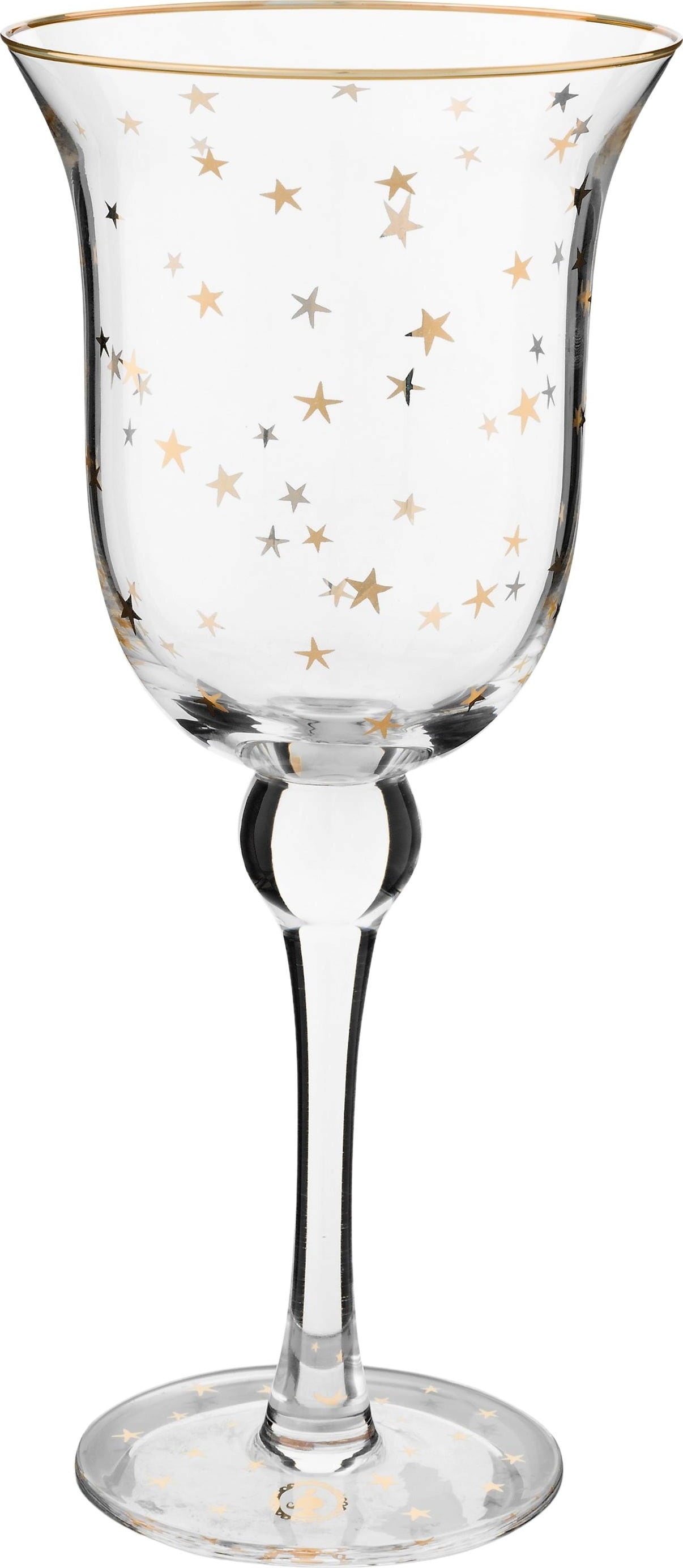 Låt dina drycker glänsa med stil i detta vackra vinglas från Pip Studio! Glaset är tillverkat av klart, högkvalitativt glas och dekorerat med fina stjärnor i guld och silver. En tunn guldkant ger en lyxig känsla, medan den eleganta stjälken med sin pärlformade detalj gör glaset till en riktig blickfångare. Dessutom rymmer glaset generösa 390 ml.
