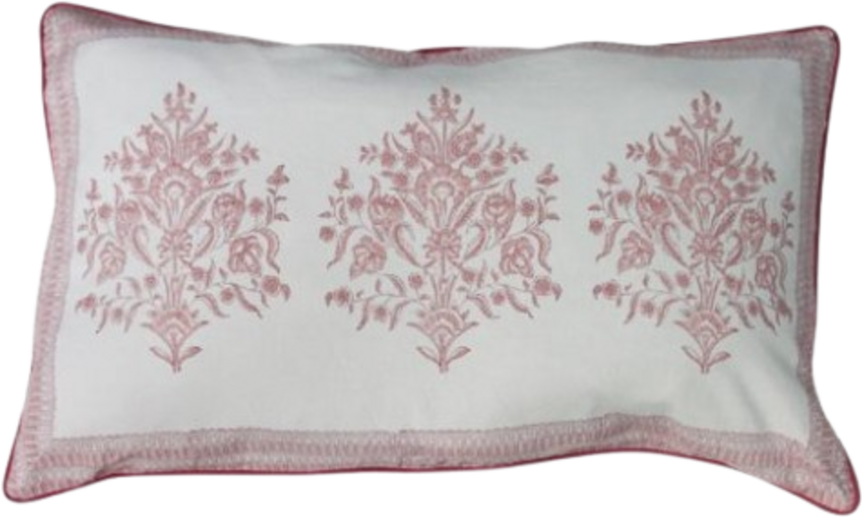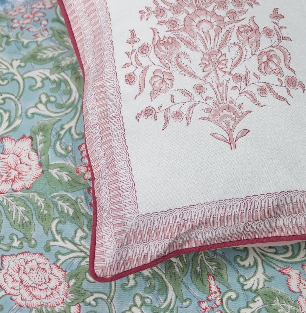 Det lekfulla, handgjorda blocktrycket gör den här prydnadskudden till det perfekta föremålet för sängen eller soffan. Den tryckta framsidan avrundas med den broderade pipingen, medan baksidan i mjuk, enfärgad sammet döljer dragkedjan.