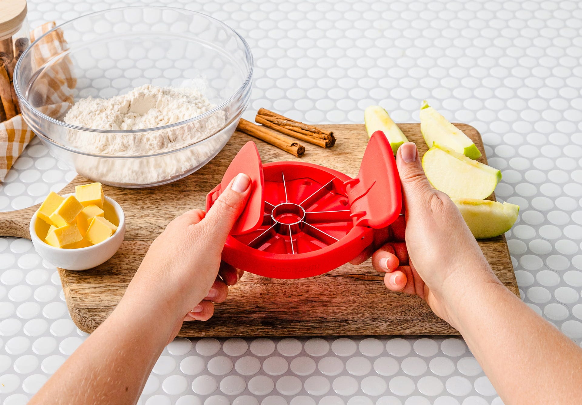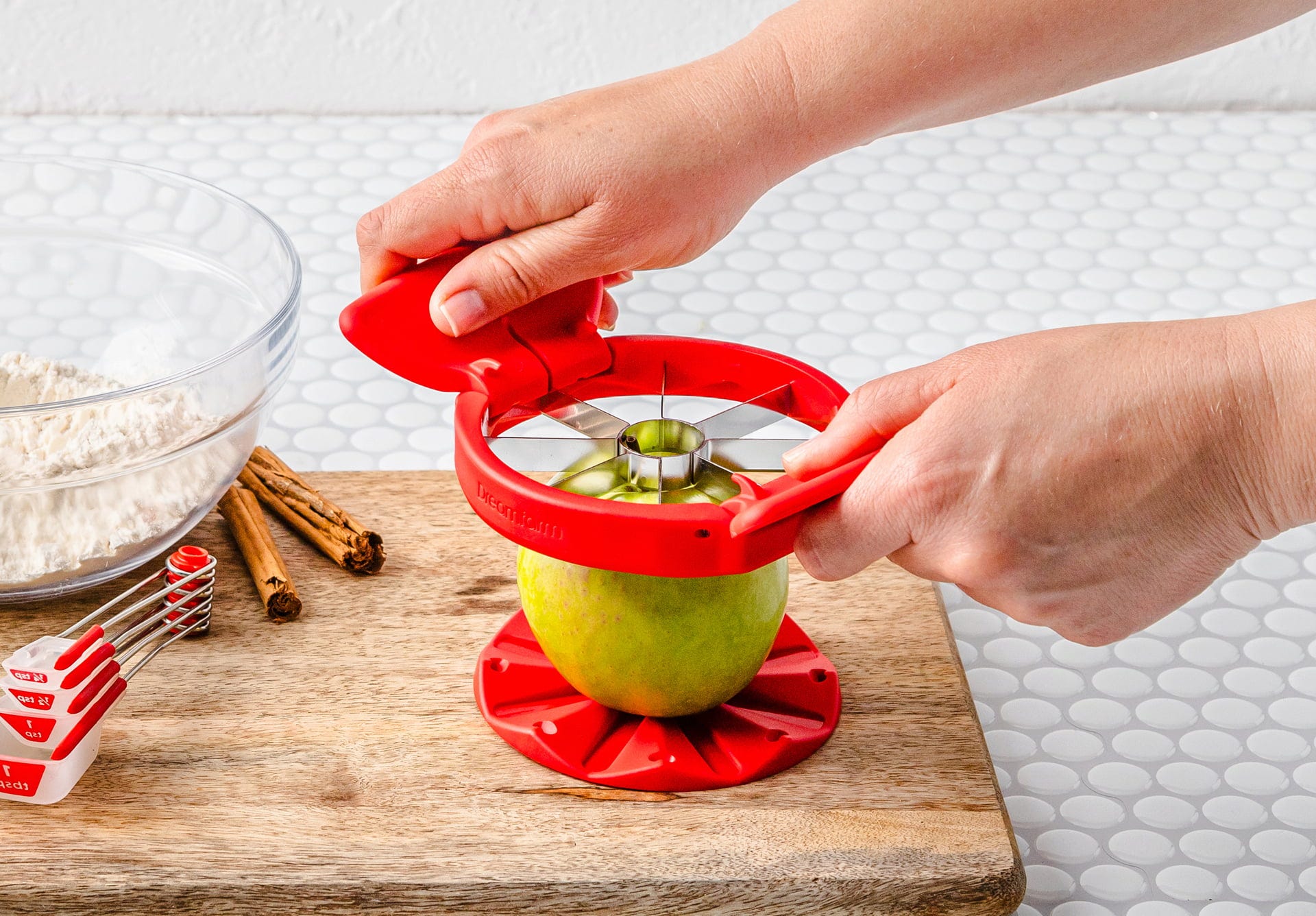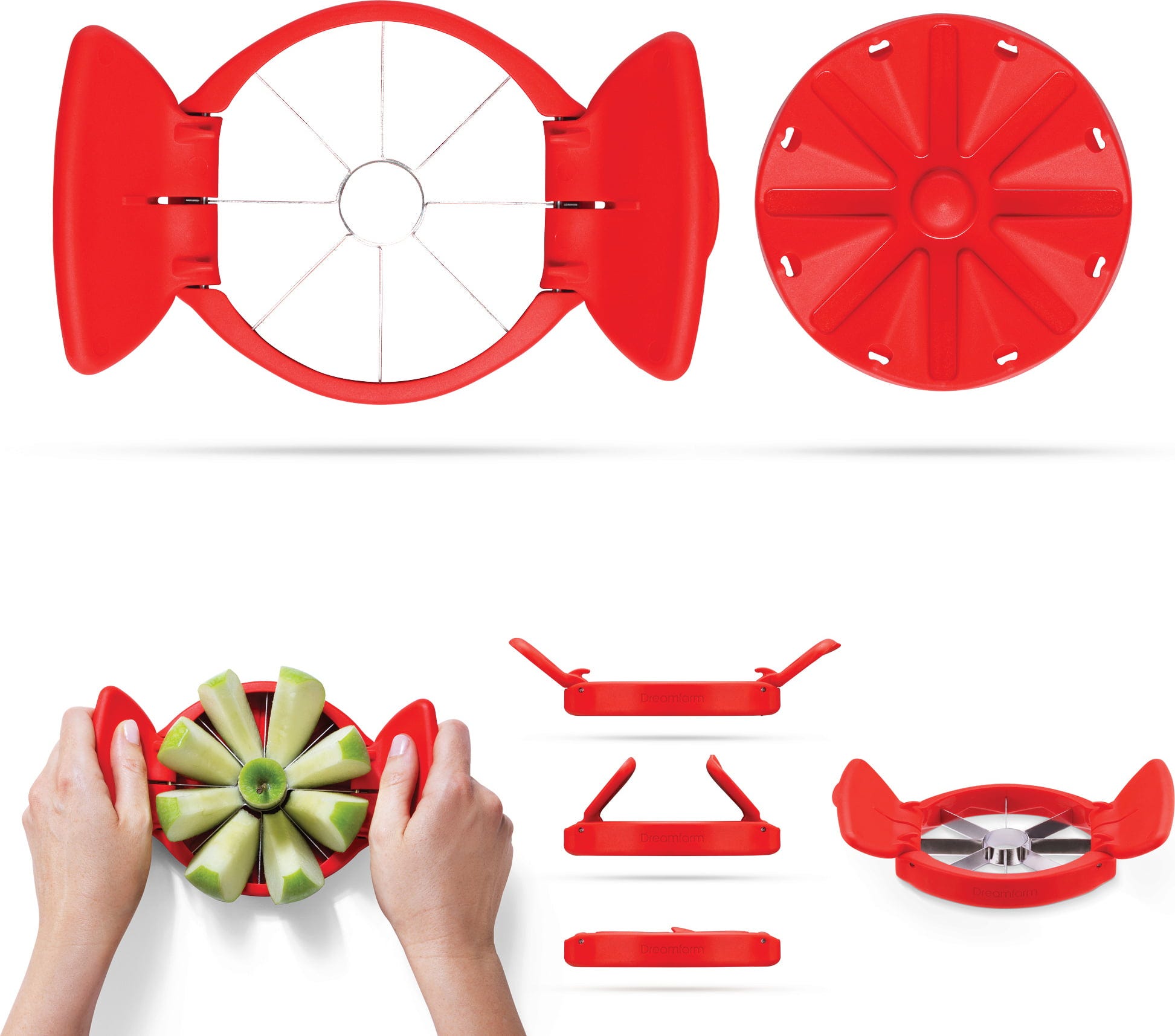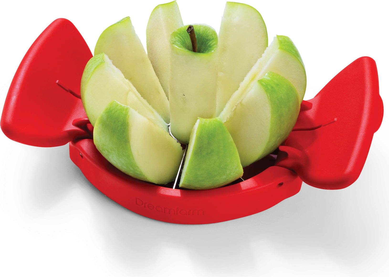 Med äppeldelaren Flapple från Dreamfarm delar du äpplen i alla storlekar i ett grepp till åtta jämna klyftor samtidigt som kärnhuset tas bort rent och snyggt! Tack vare det praktiska underlägget kommer de vassa bladen i rostfritt stål inte i kontakt med underlaget, så du behöver inte ens en skärbräda.