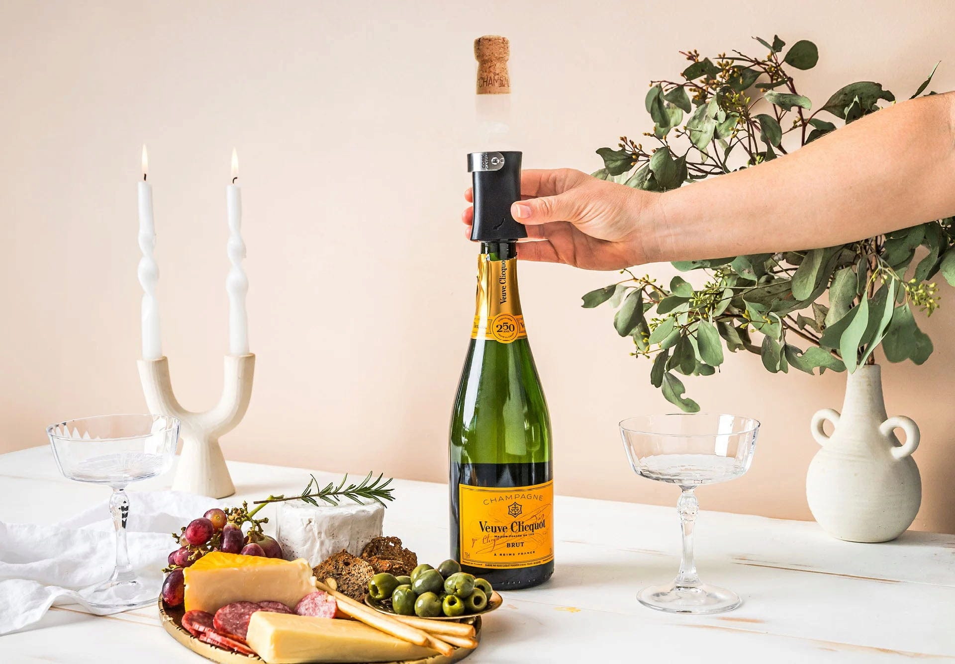 Med Champop från Dreamfarm behöver du inte längre oroa dig för okontrollerat flygande korkar eller dryck som skummar över när du öppnar champagneflaskor! Det smarta verktyget placeras enkelt på flaskhalsen och vrids lätt för att lossa korken kontrollerat. Tack vare de integrerade ventilationsspringorna släpps trycket ut mjukt och korkens hastighet minskar så att den fångas upp säkert i höljet - det är låsläget.