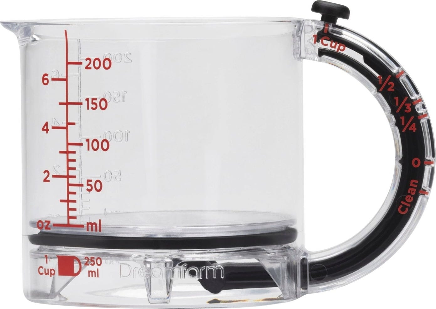 Det unika är den enkla tömningen: skjut botten uppåt efter mätning så ser den integrerade tätningsringen till att varje droppe hamnar i skålen i stället för att fastna i bägaren. Tillverkad av robusta, BPA-fria material kan den dessutom enkelt tas isär helt och diskas i diskmaskin efter bakningen.