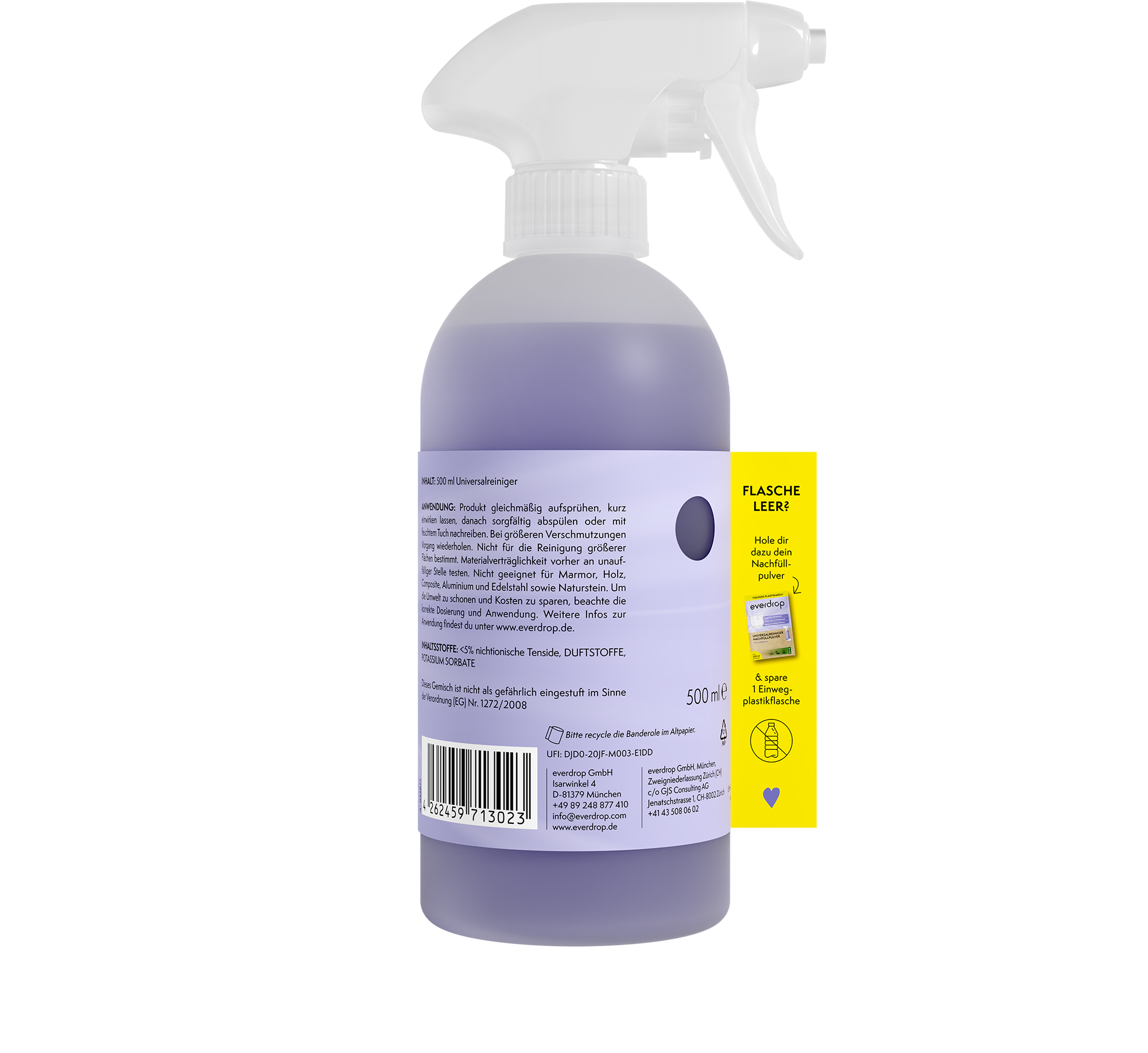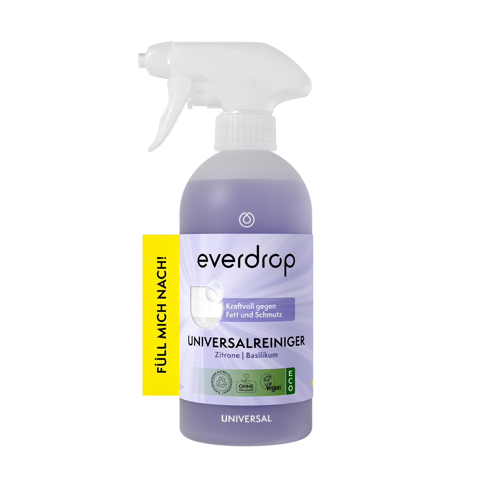 Den förfyllda universalrengöringsmedlet är den perfekta lösningen för att effektivt ta bort smuts och fett från ditt hem. Du kan återanvända flaskan så ofta du vill och fylla på den med everdrops refillpulver - detta innebär inte bara mindre avfall, utan sparar också mycket koldioxidutsläpp. Äntligen kan du må bra medan du städar!
