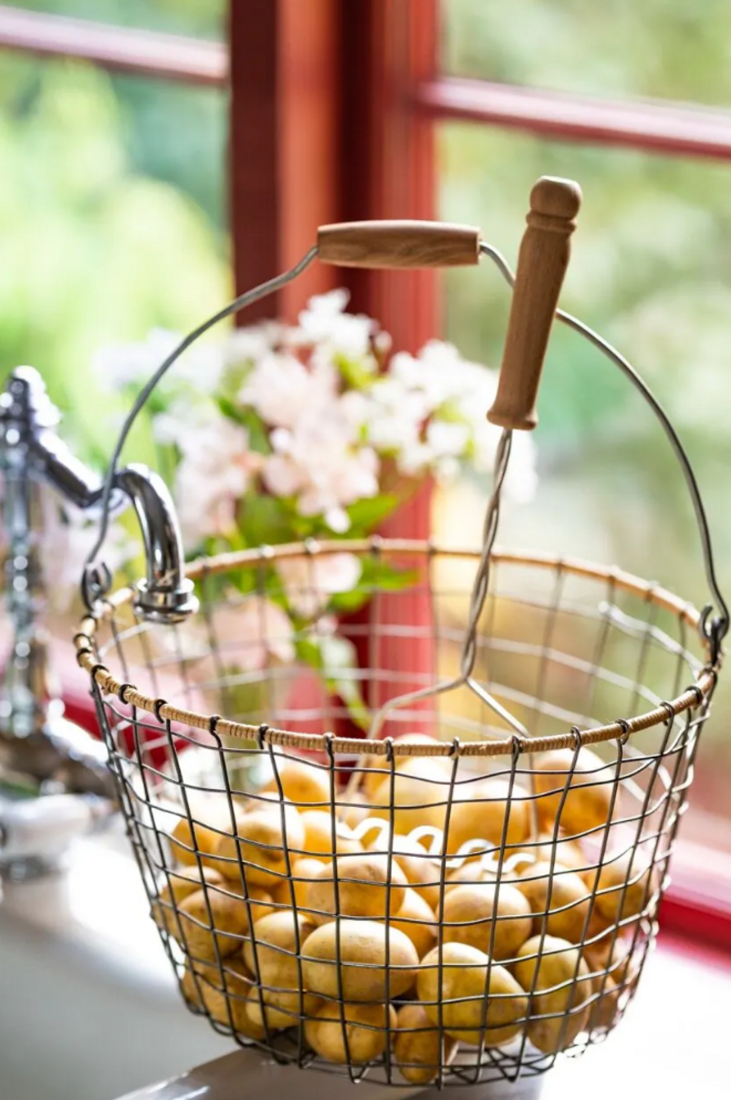 Trådkorgen Alvar förenar funktion med en tidlös look. Tack vare det avtagbara trähandtaget är den enkel att bära och använda på många sätt, oavsett om det är för förvaring i köket, badrummet eller för att samla frukt, grönsaker eller blommor i trädgården.