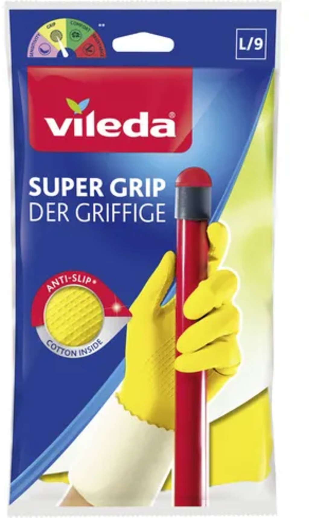 Den halkfria Super Grip-rengöringshandsken av naturlatex från vileda ger optimalt skydd för alla hushållssysslor. Dess ComfortPlus-innerbeläggning garanterar också hög fuktabsorption och en bekväm känsla.