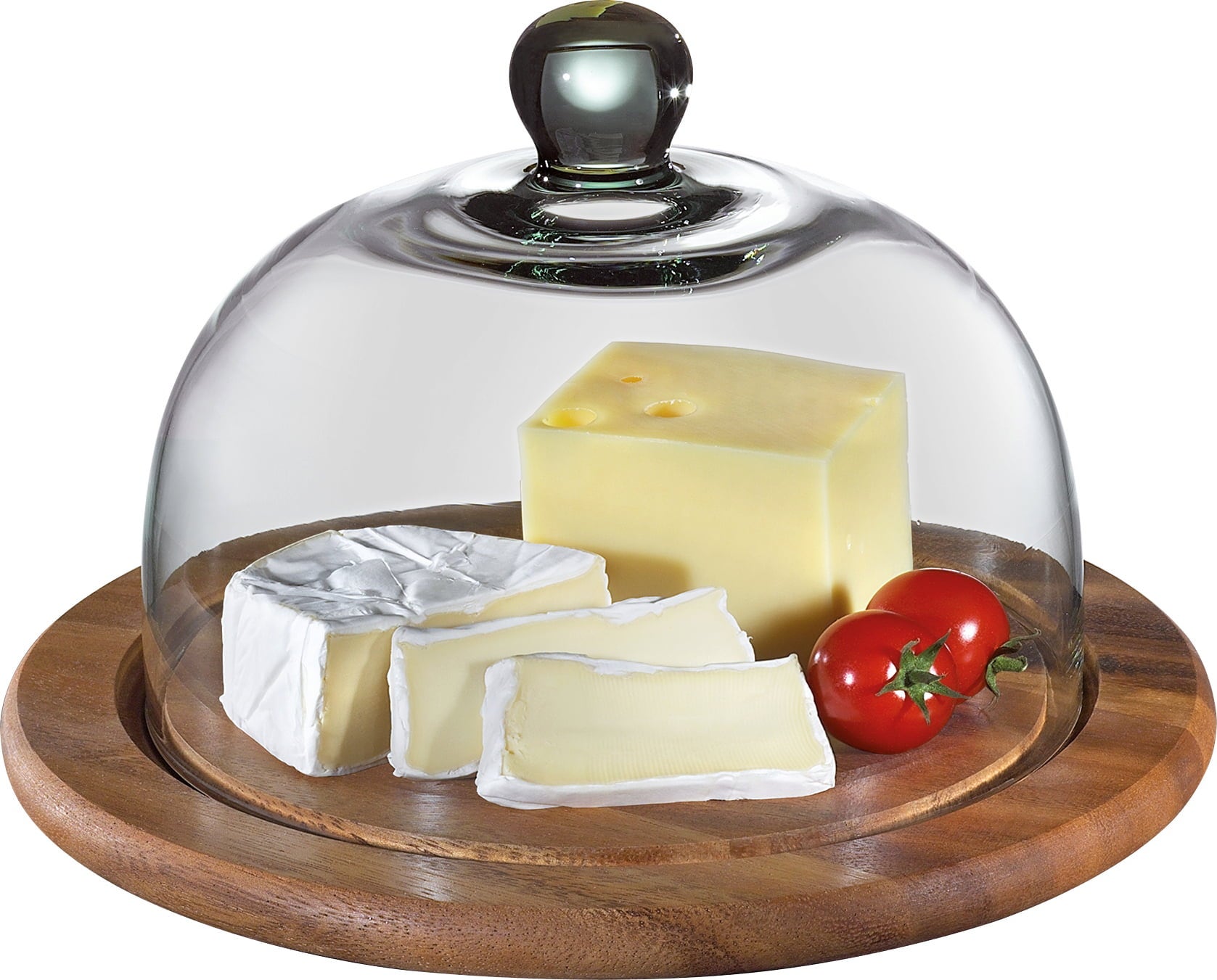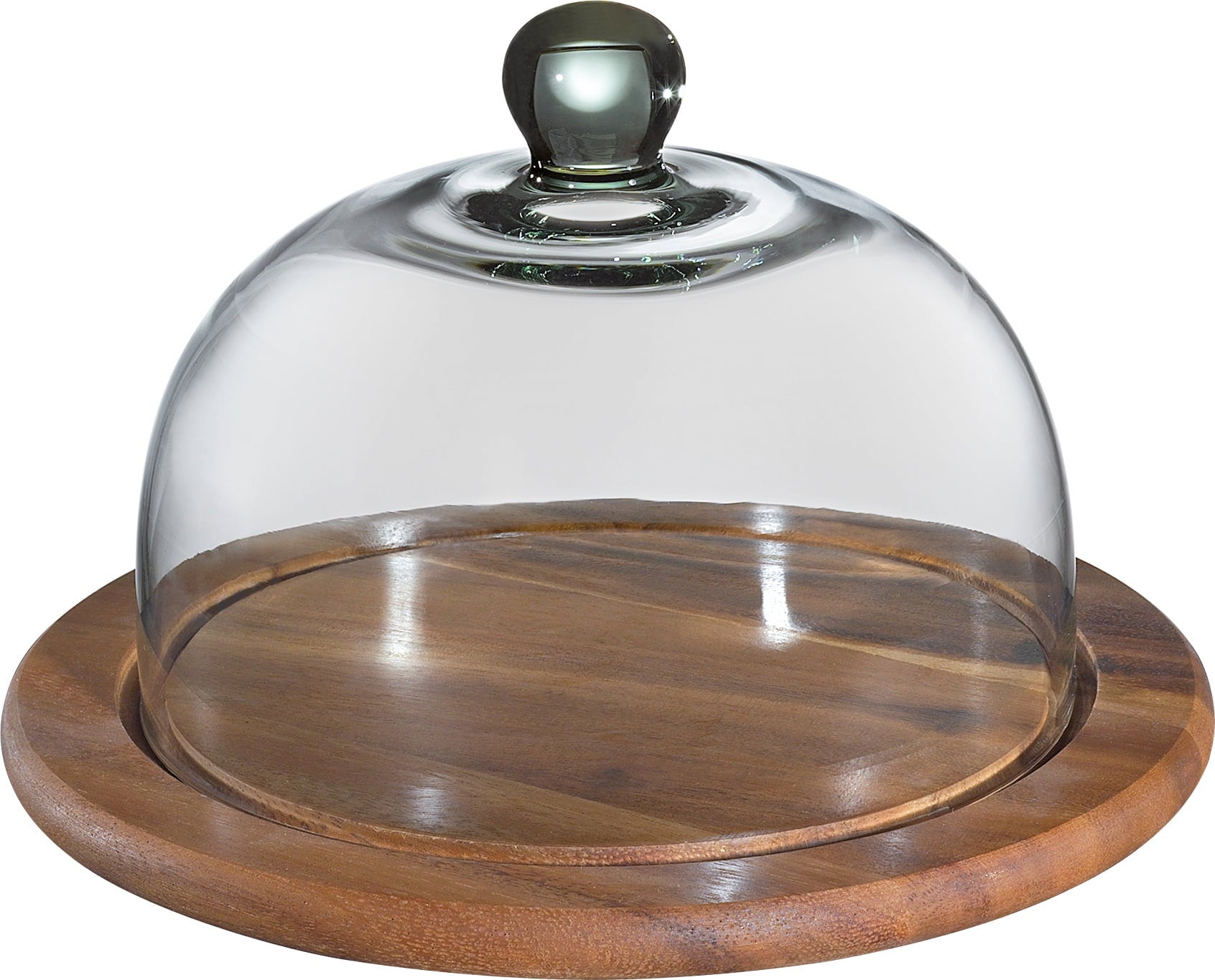 Ostkupan från ZASSENHAUS skyddar dina ostbrickor med stil samtidigt som både mjuka, halvhårda och hårda ostar får utveckla sin fulla smak. Det mörka akaciaträet kommer från hållbart skogsbruk, och glaskupan håller osten hygienisk. Perfekt för både matbord och utomhusservering. En elegant lösning för alla ostälskare.