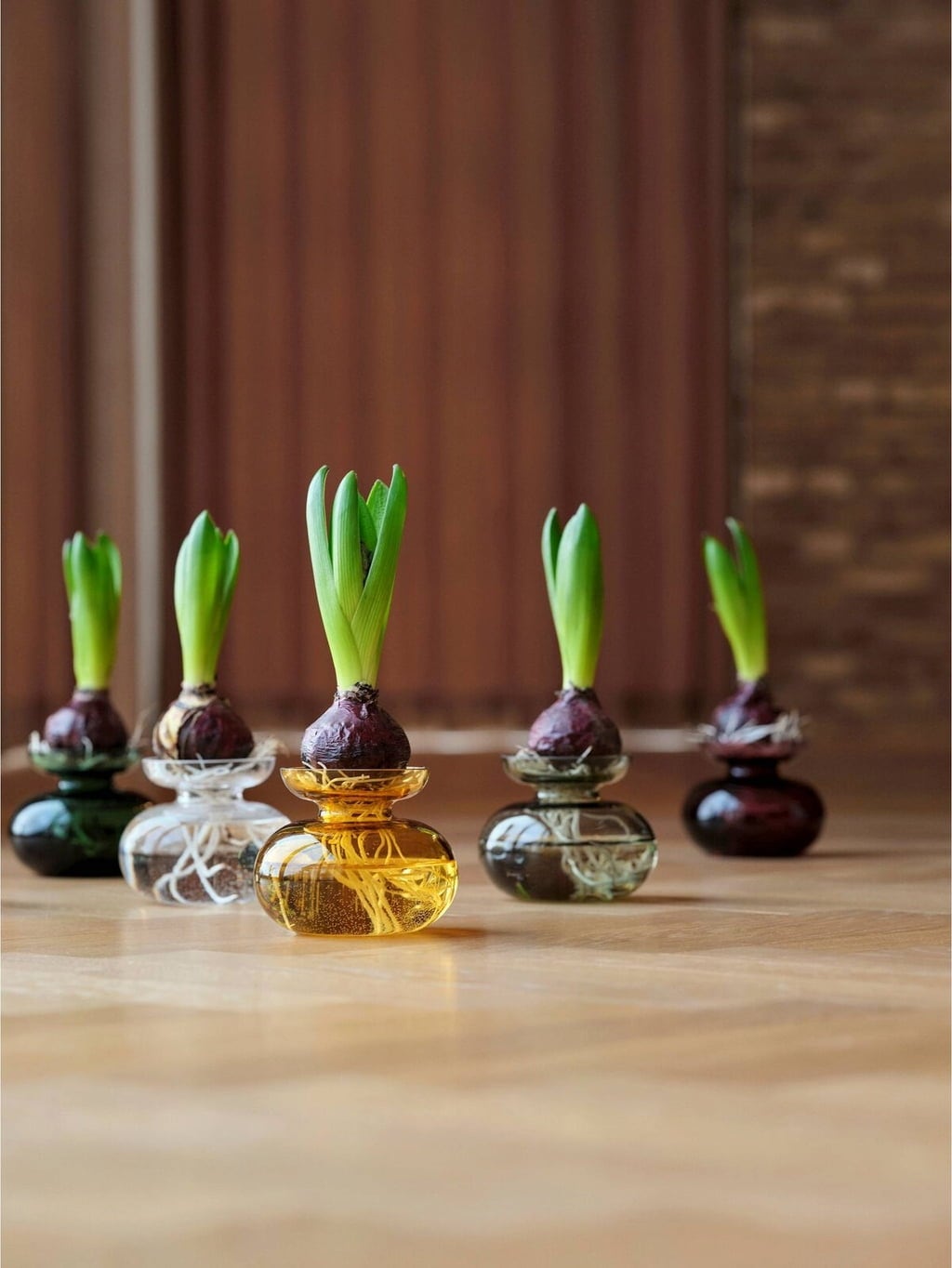 Tack vare det lilla formatet passar vasen perfekt för hyacinter och andra lökväxter, samt för nätta buketter med vår- eller ängsblommor!